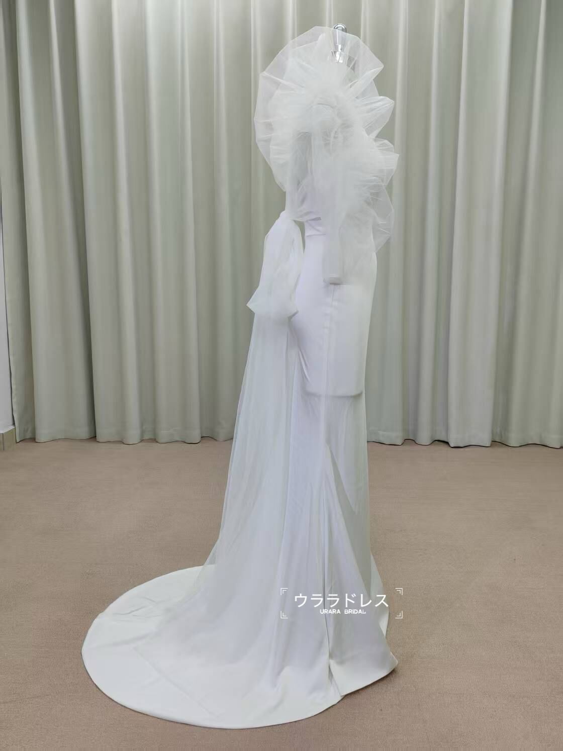 すっきりとしたシルエットに軽やかなチュールが映え、前撮りやフォトウェディング、二次会にもおすすめ。