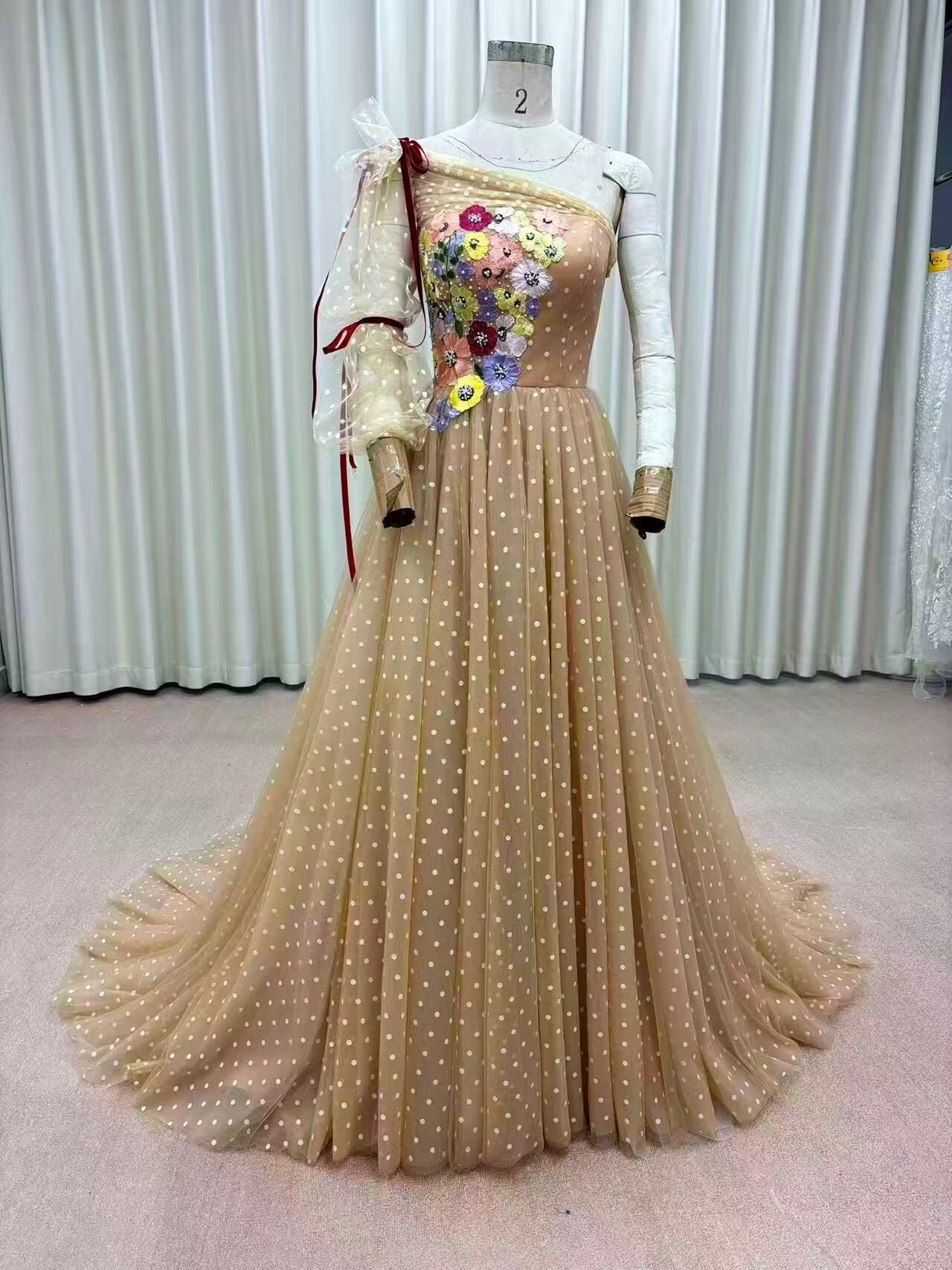 柔らかなドットチュールに、色とりどりの花刺繍をあしらったワンショルダードレス。