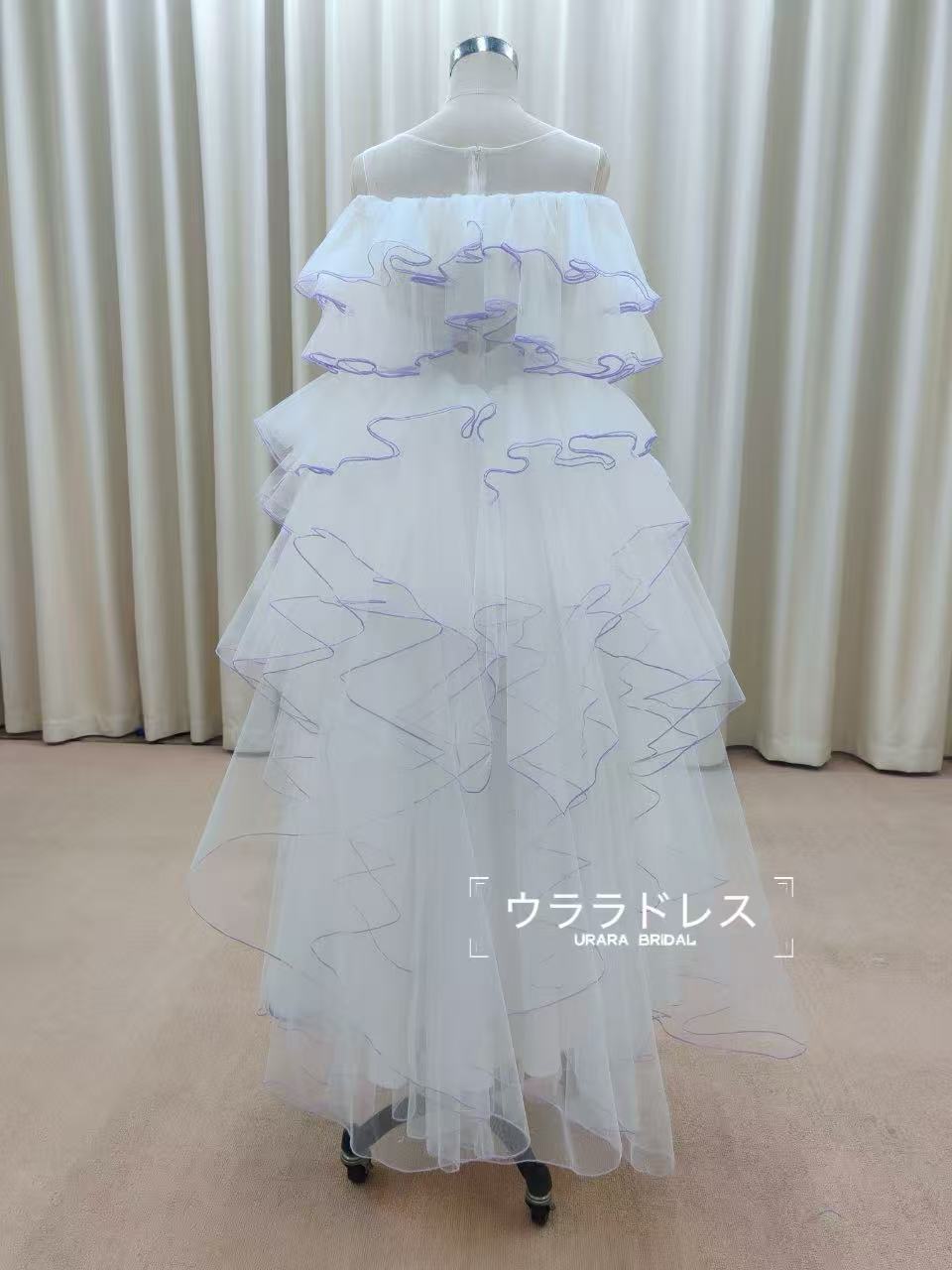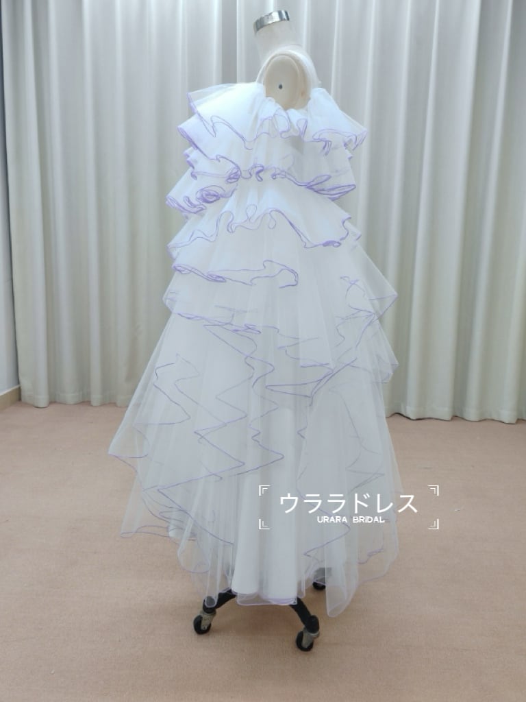 紫のパイピングが可愛い ティアードフリル チュール ウェディングドレス 演奏会 二次会