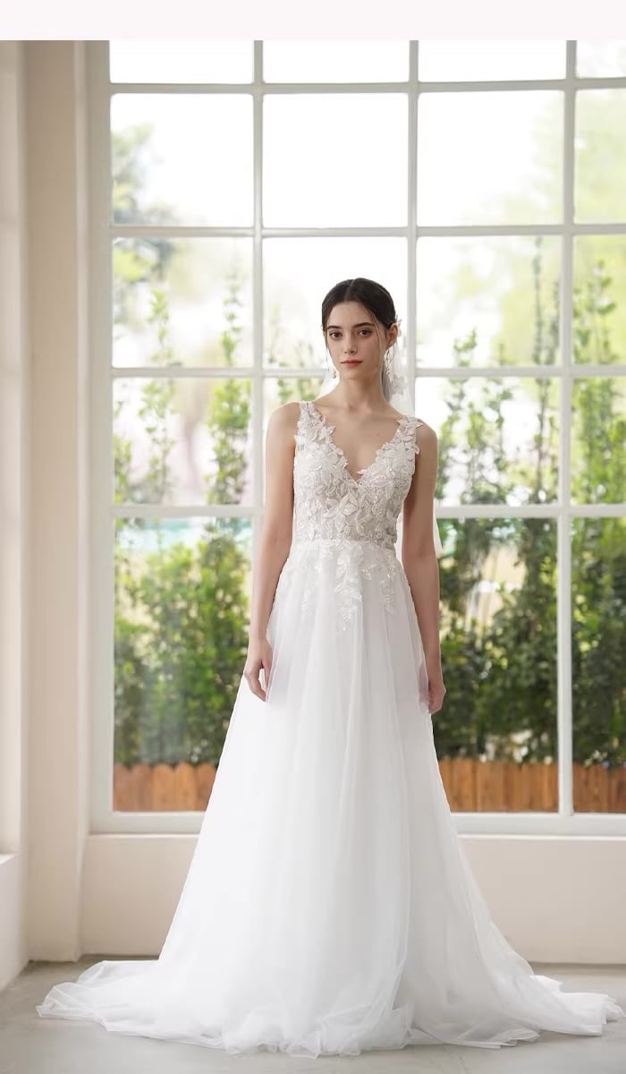 背中Vカット レース ウェディングドレス スレンダーライン ロング丈
