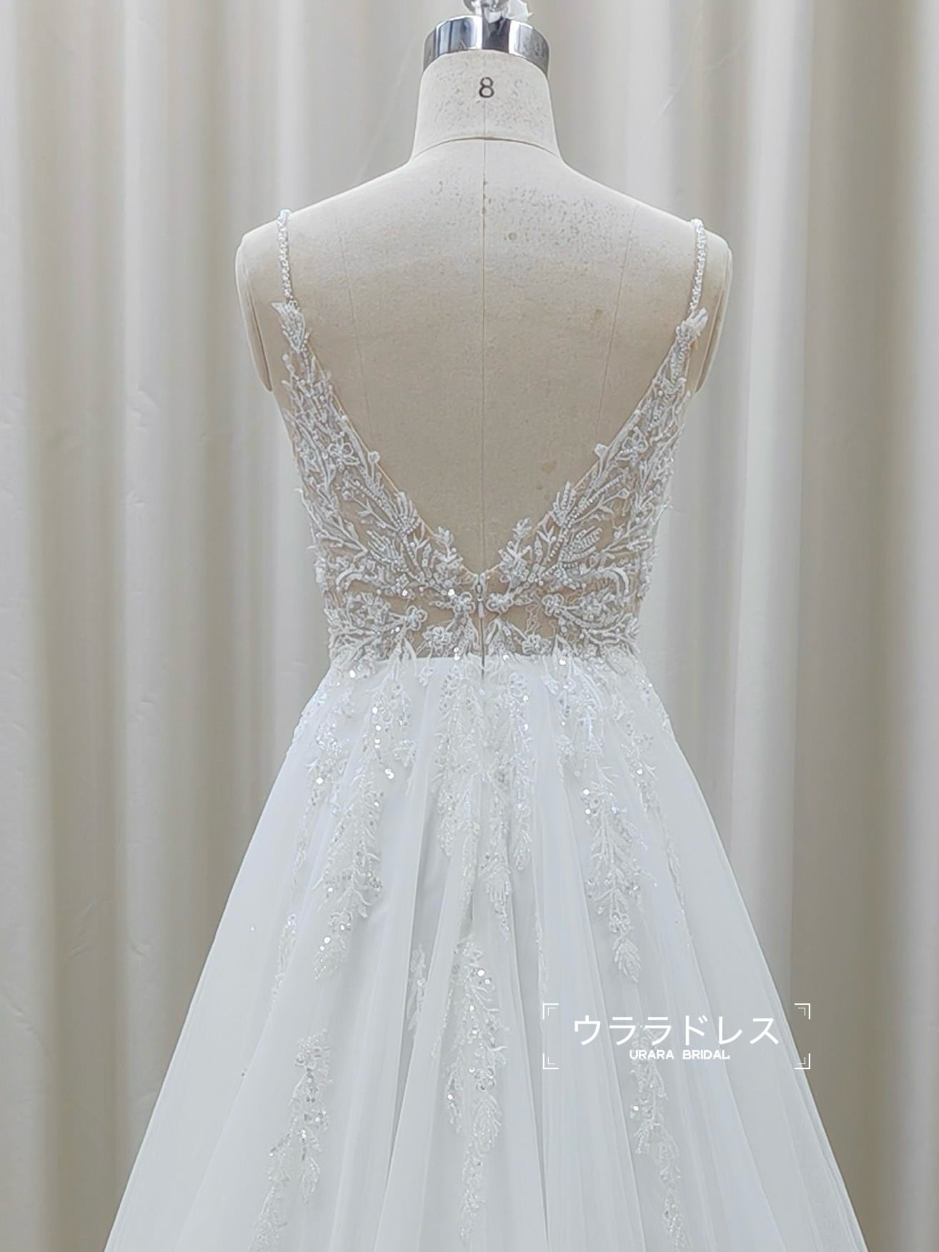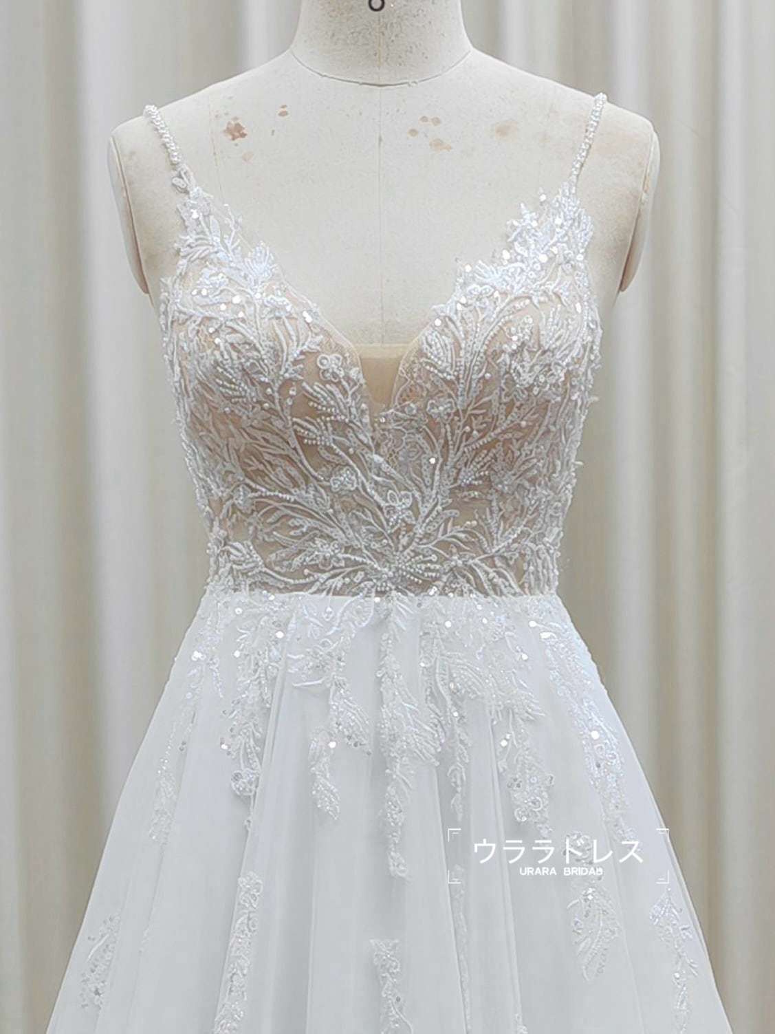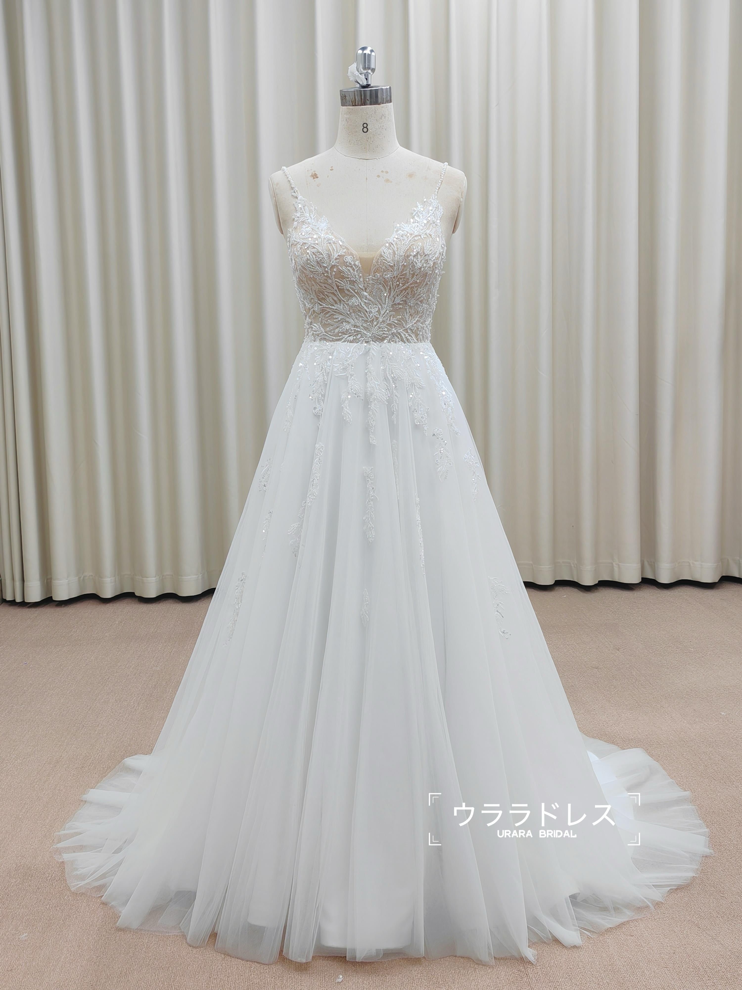繊細レース×細ストラップのAラインドレス|軽やかなチュールスカートの上品デザインf