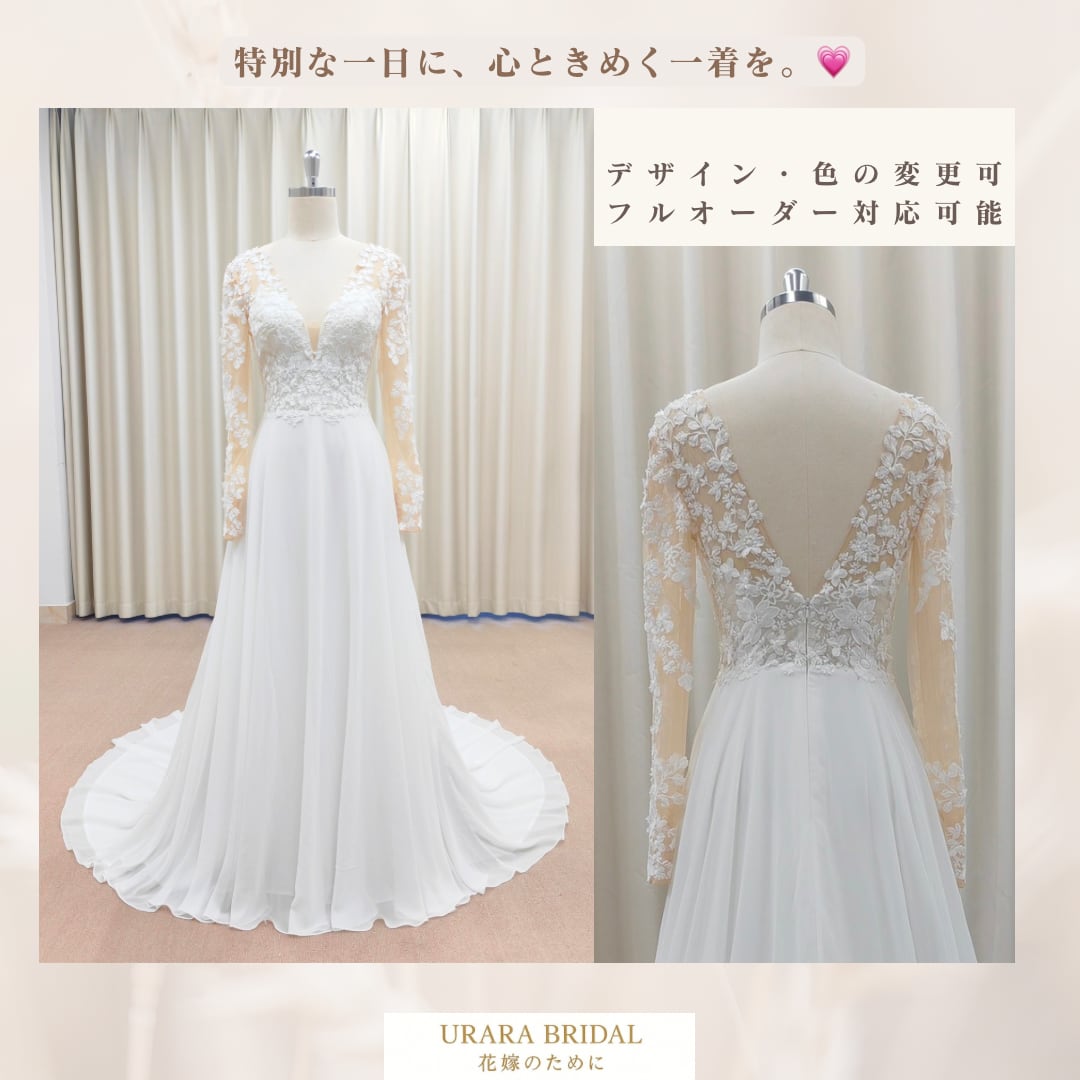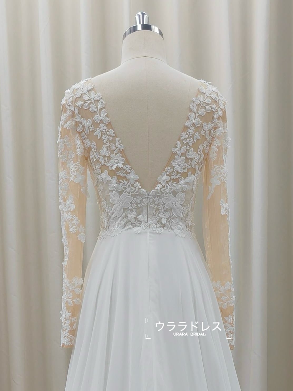 総レース長袖ウェディングドレス|Vバックが美しいAラインドレス