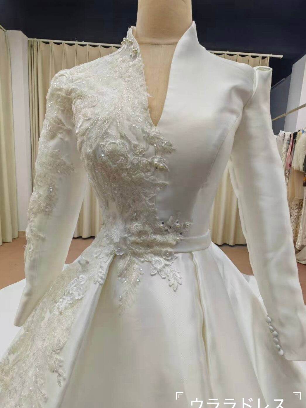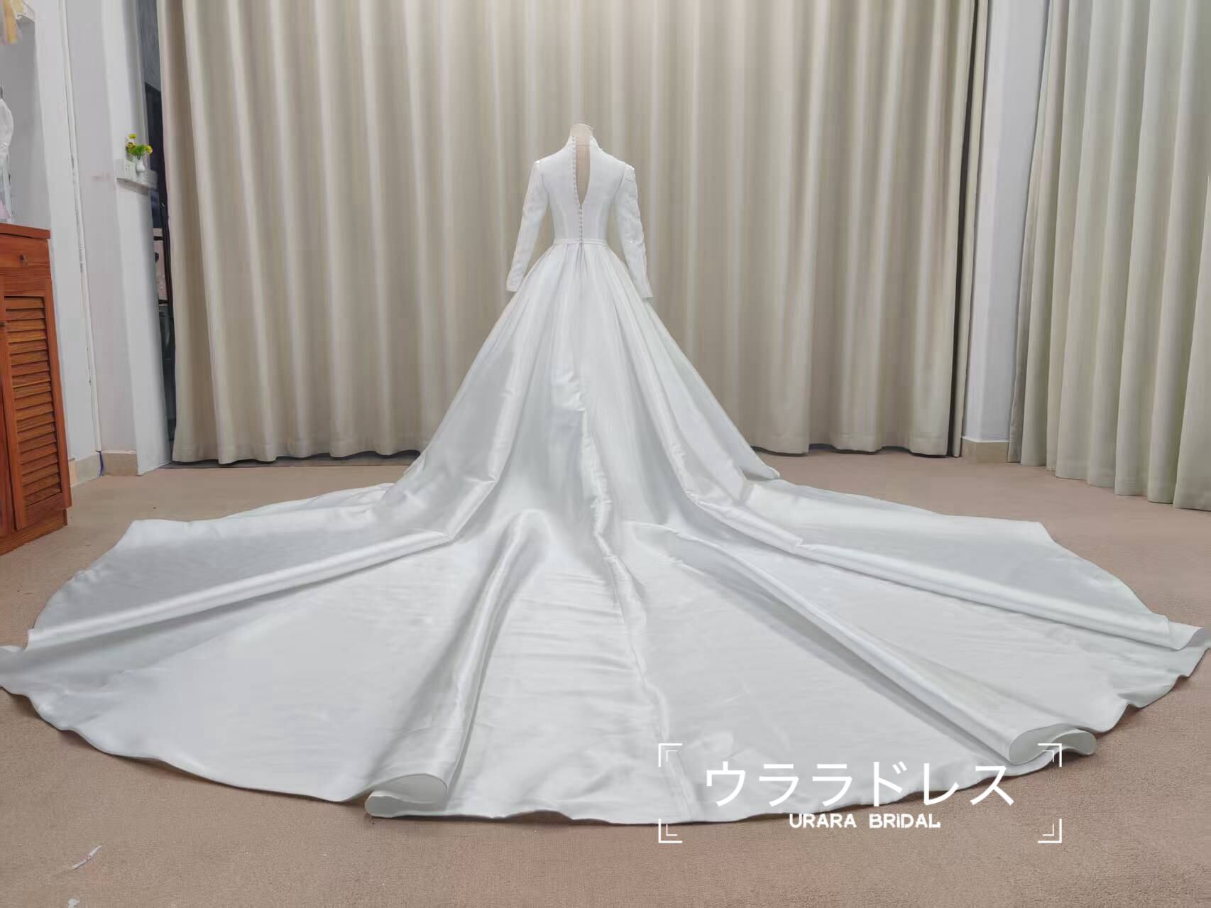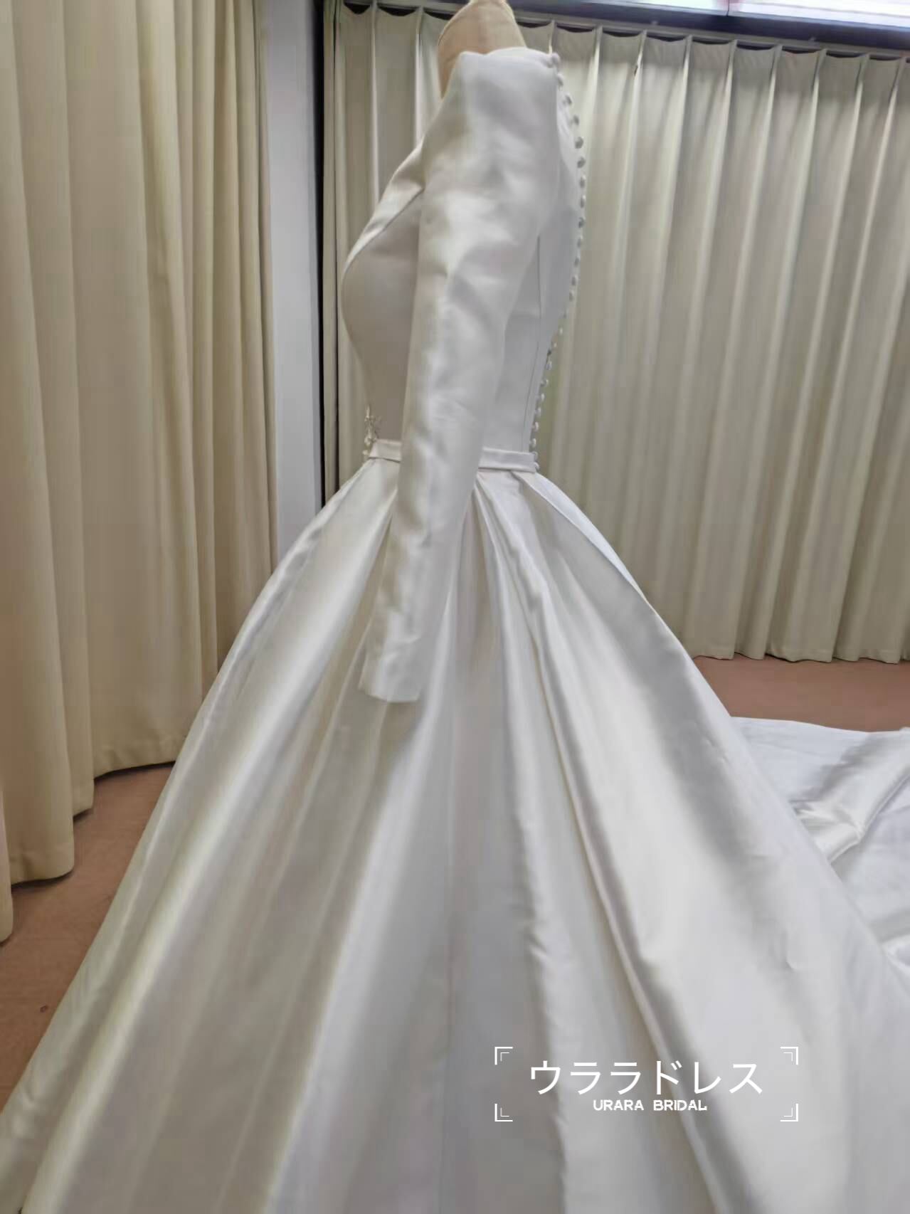 高貴なサテン×レース 長袖ウェディングドレス ロングトレーン クラシカル