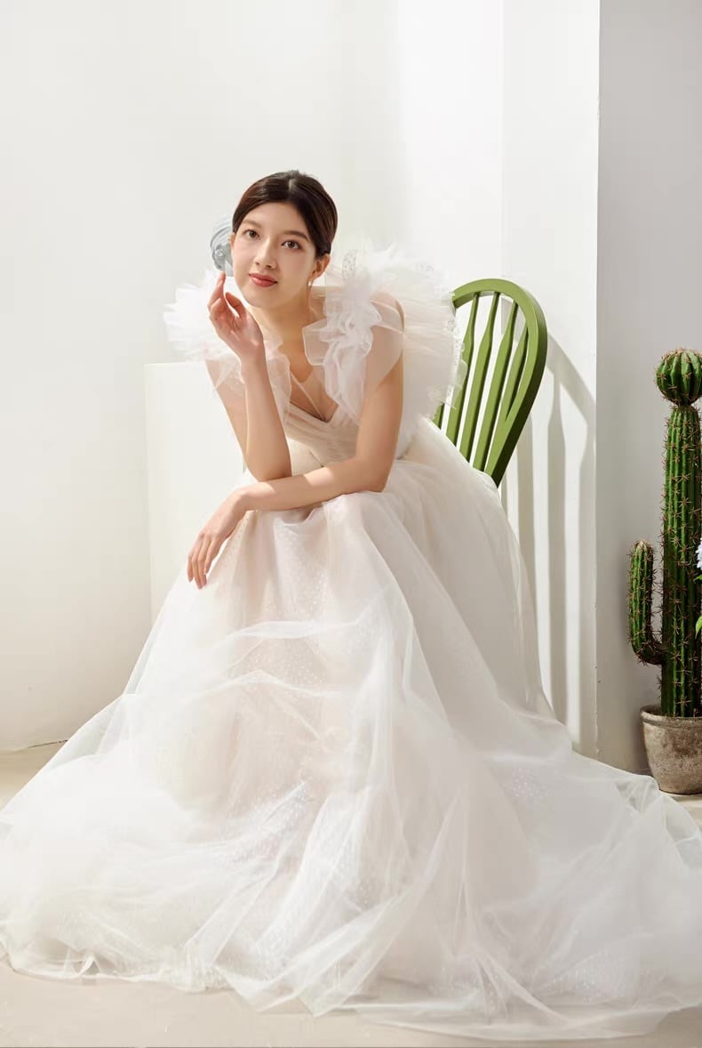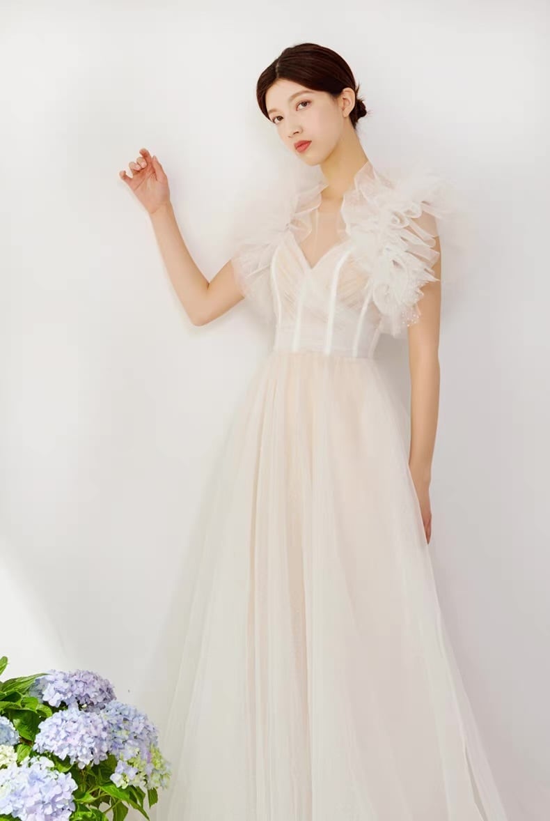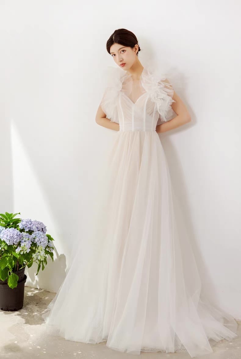 バックV ウェディングドレス 花嫁 フリル袖 チュール ロングドレス 前撮り