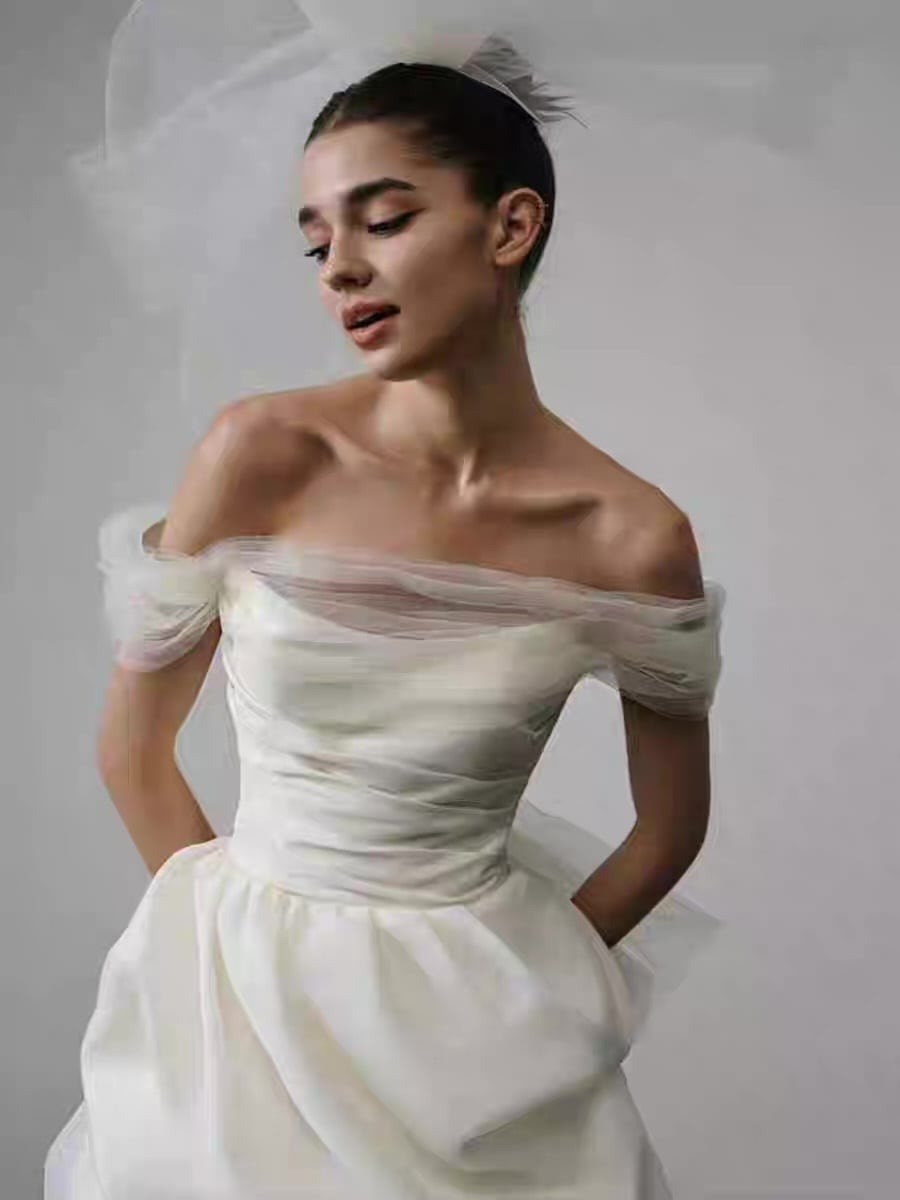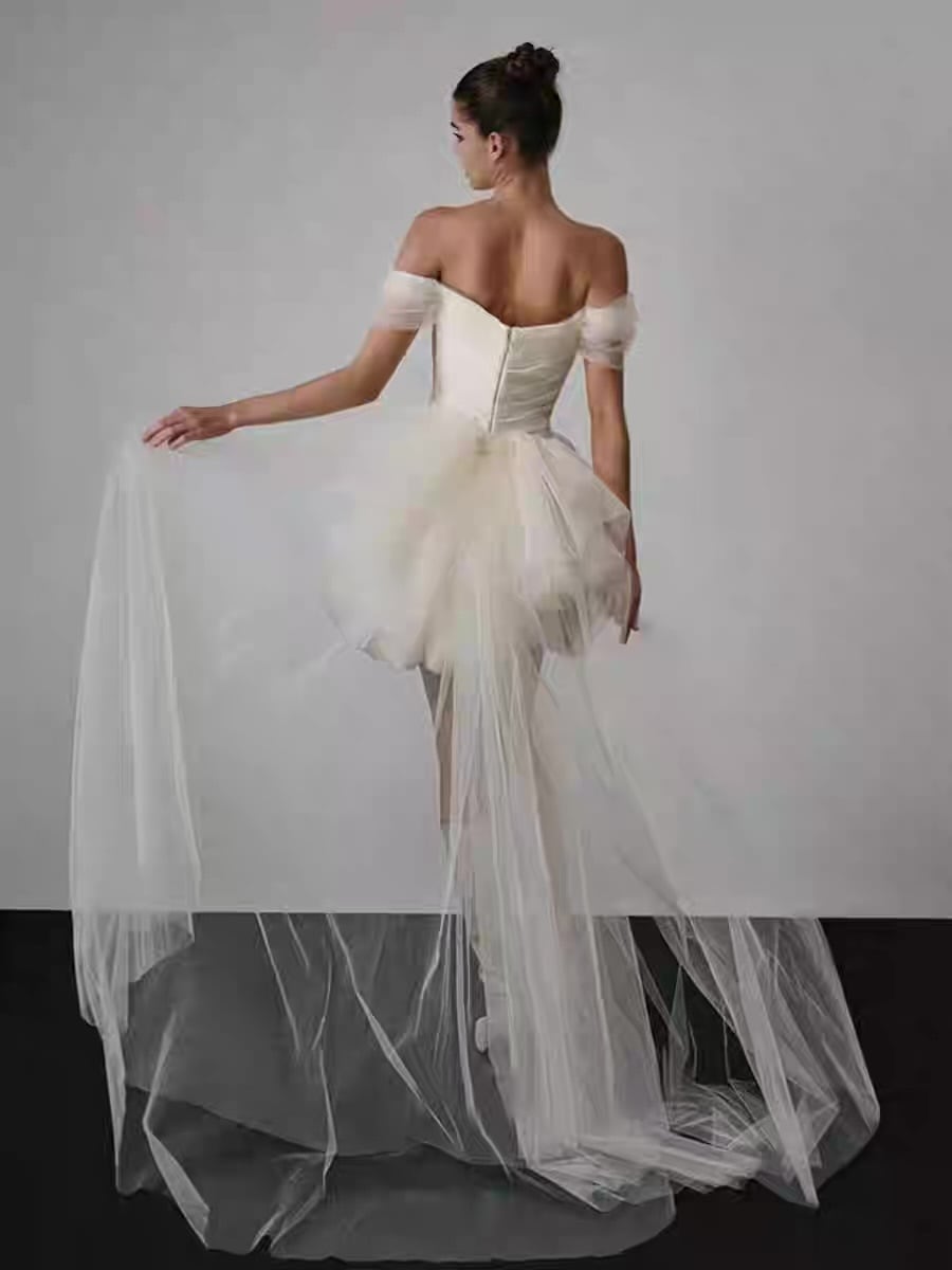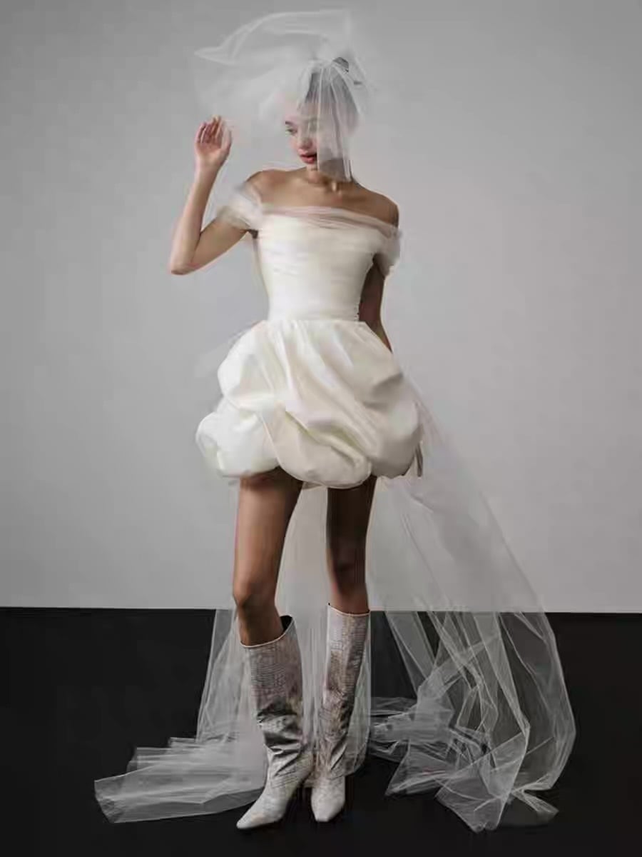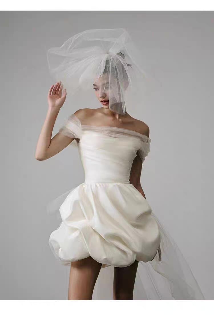 フレンチミニ丈バブルヘムウェディングドレス|オフショルダー軽やか花嫁ドレス
