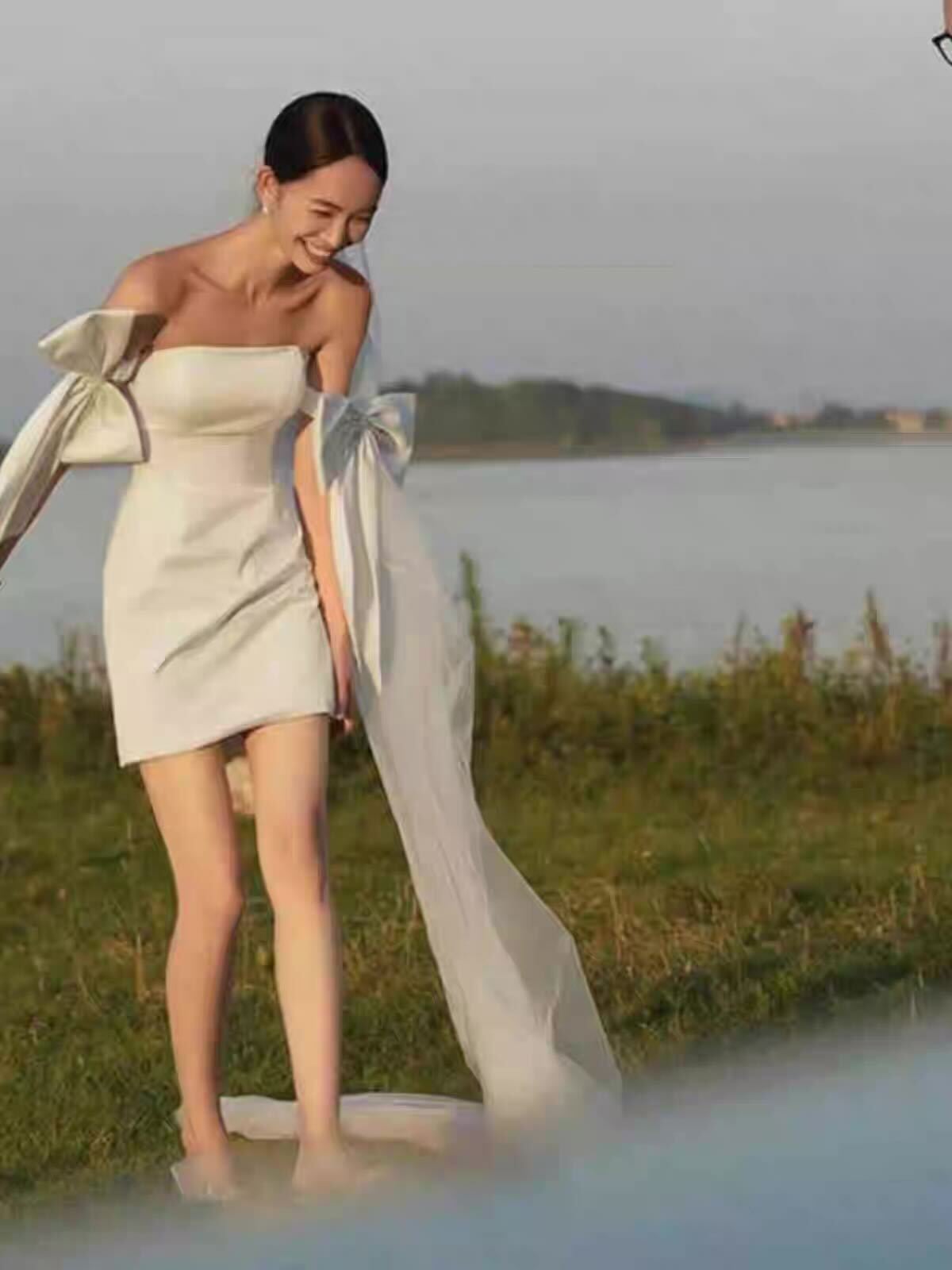 サテンミニ丈ウェディングドレス|オフショルダービッグリボン花嫁ドレス