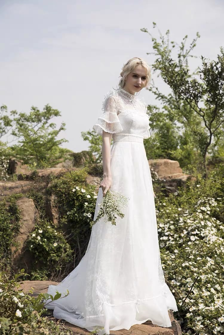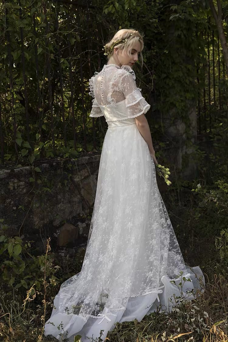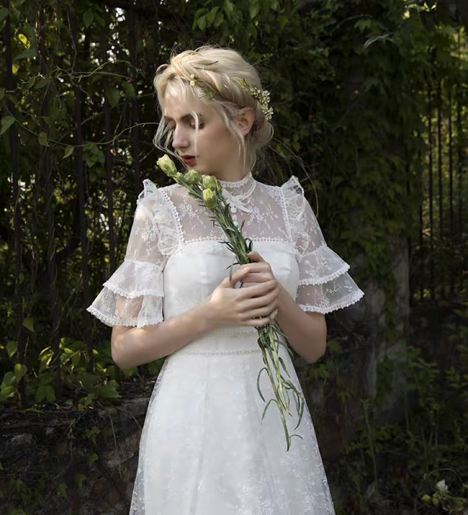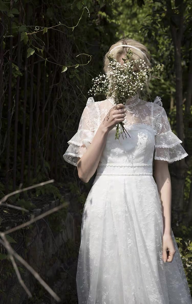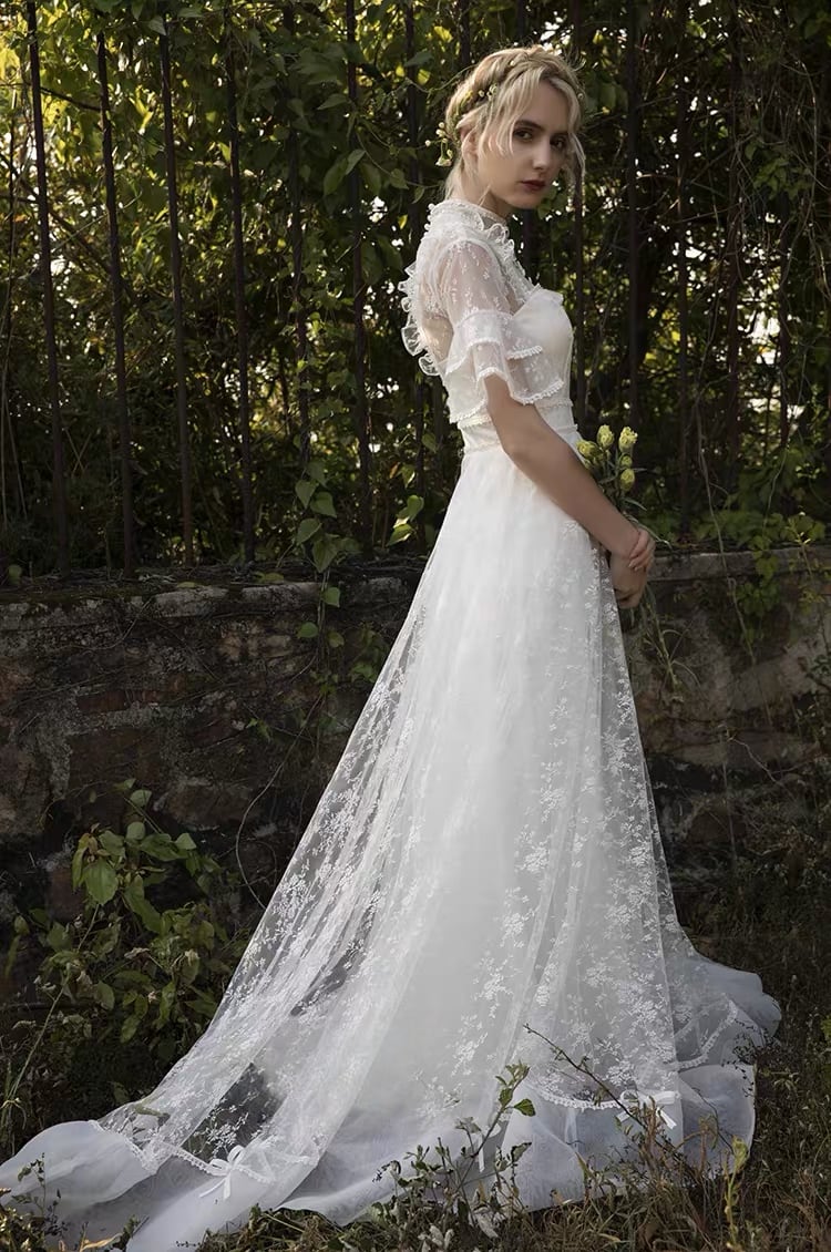 ウエディングドレス レース 半袖 ナチュラル Aライン ガーデンウェディング 花嫁 前撮り