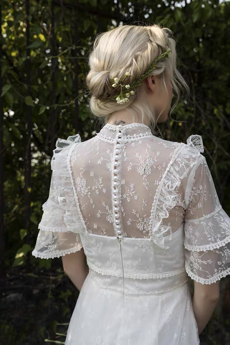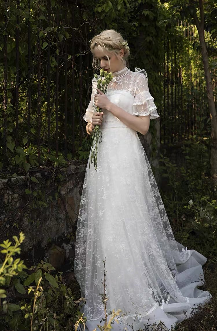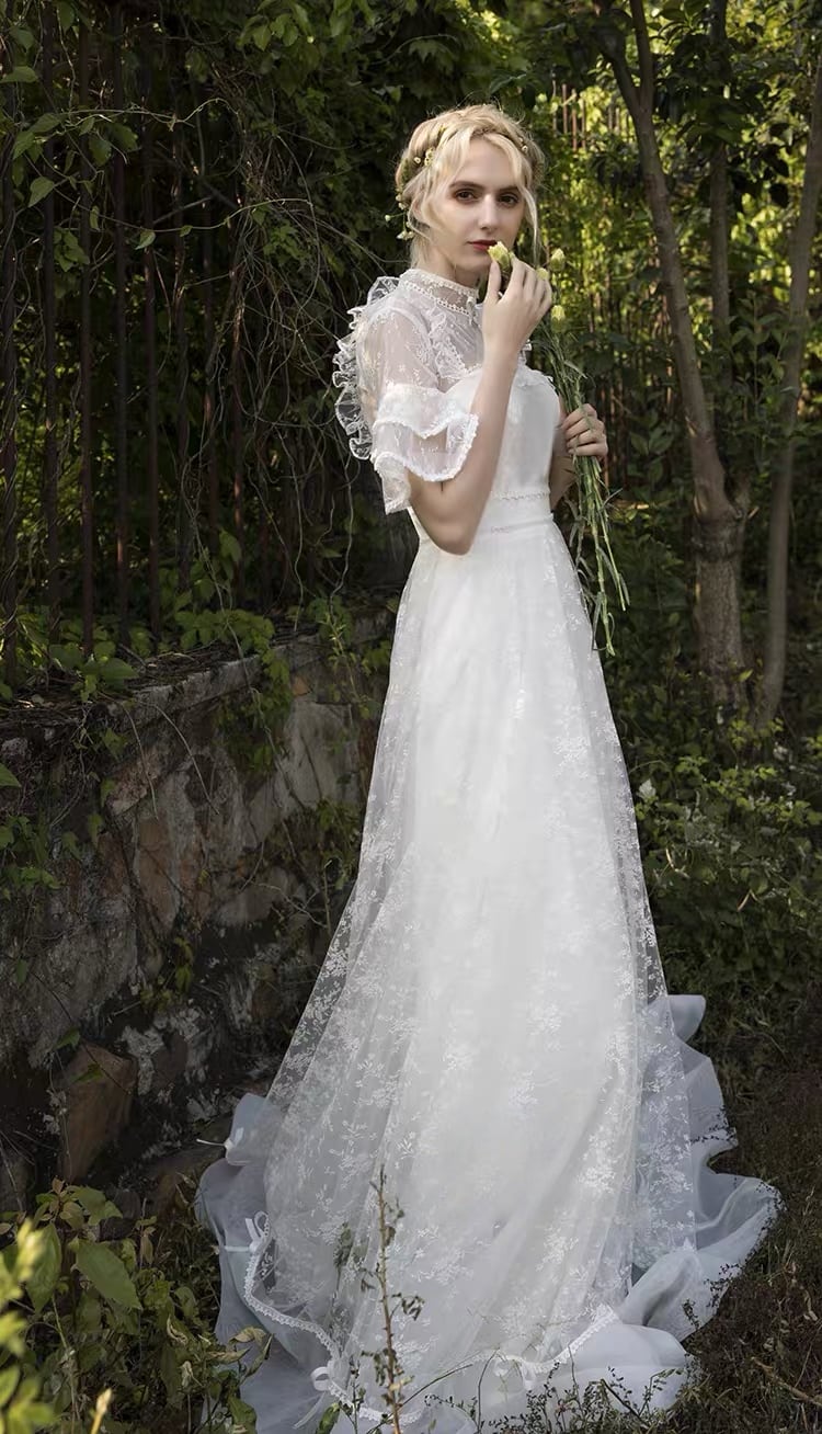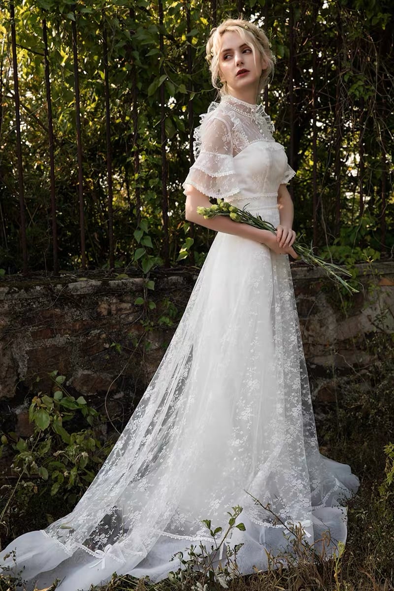 ウエディングドレス レース 半袖 ナチュラル Aライン ガーデンウェディング 花嫁 前撮り