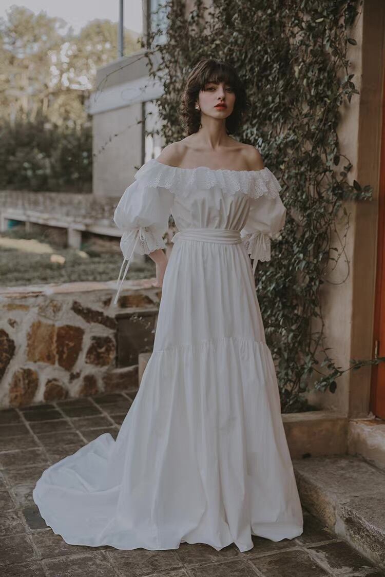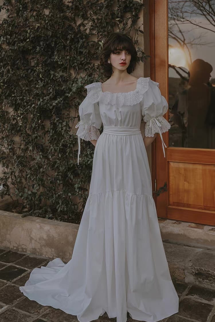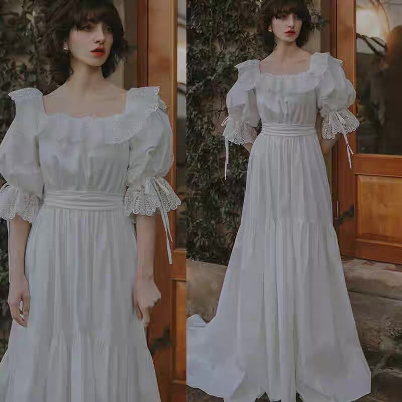 スクエアネック レース袖 ウェディングドレス フレンチ風