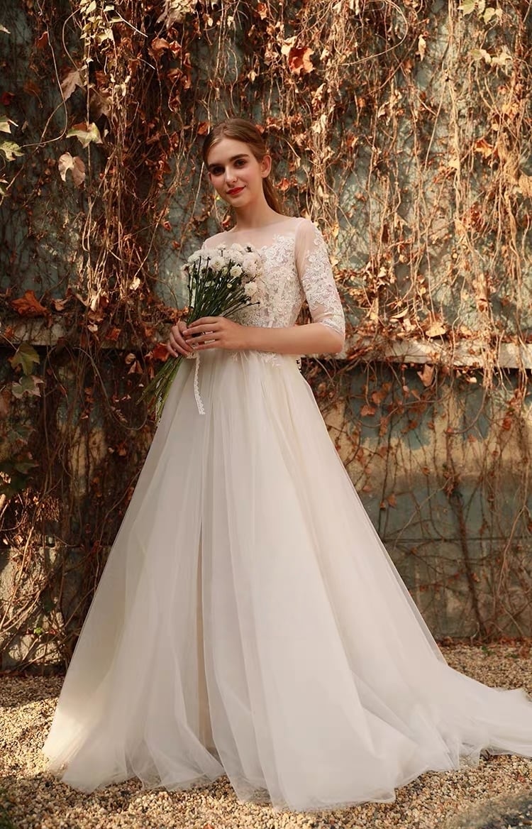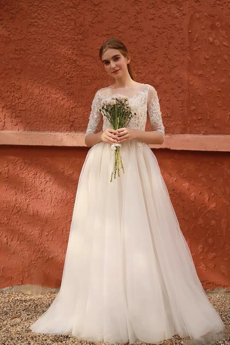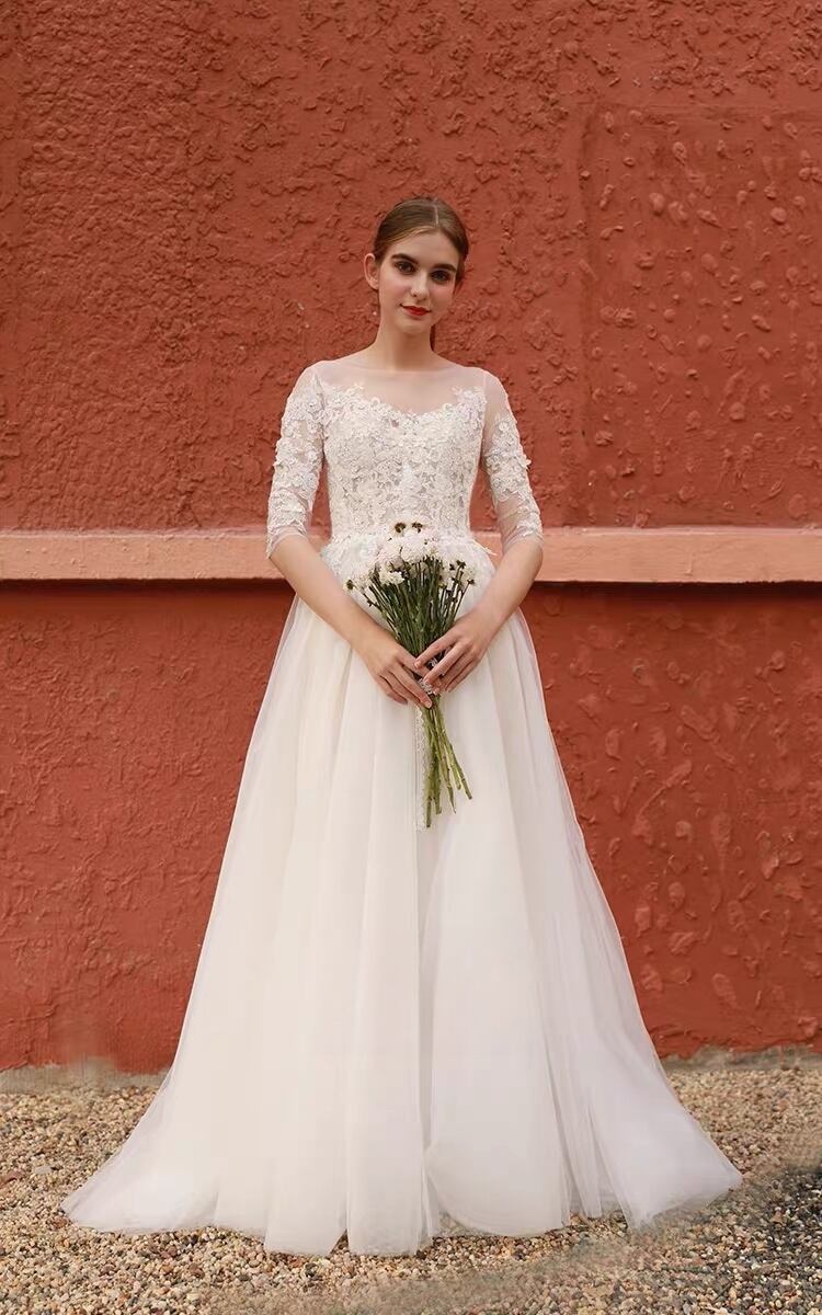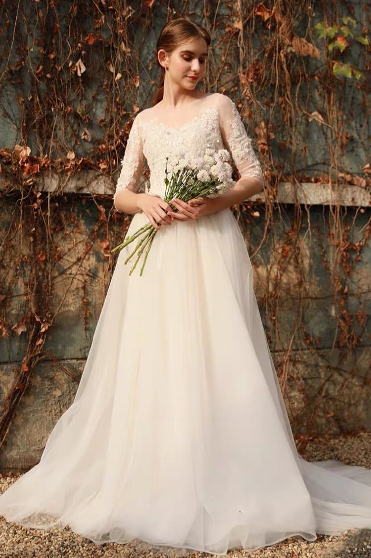 ウエディングドレス Aライン レース チュール ナチュラル 背中ボタン ロングドレス 前撮り 花嫁 二次会