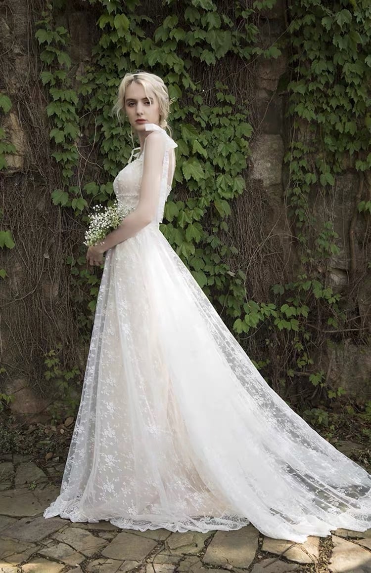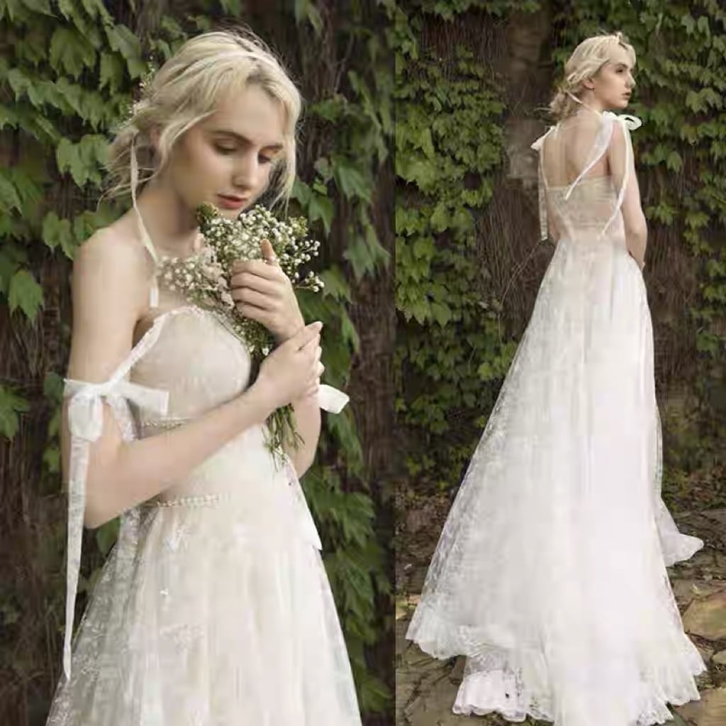 ナチュラル ウエディングドレス リボン肩 シフォン チュール 透け感 前撮り 森フォト 花嫁 二次会