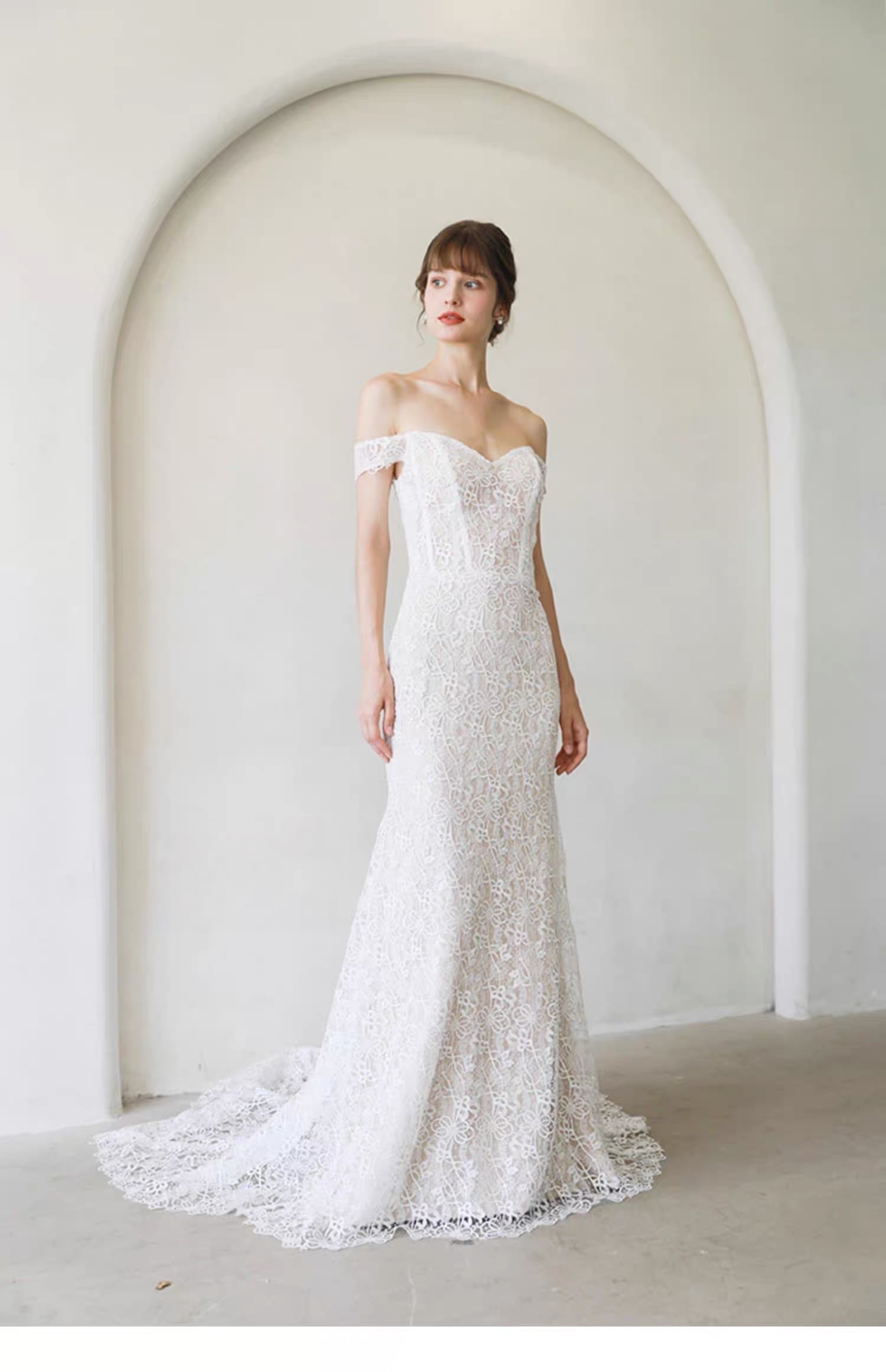 オフショルダー マーメイドドレス レース 刺繍 ロングトレーン 前撮り 二次会 上品 花嫁