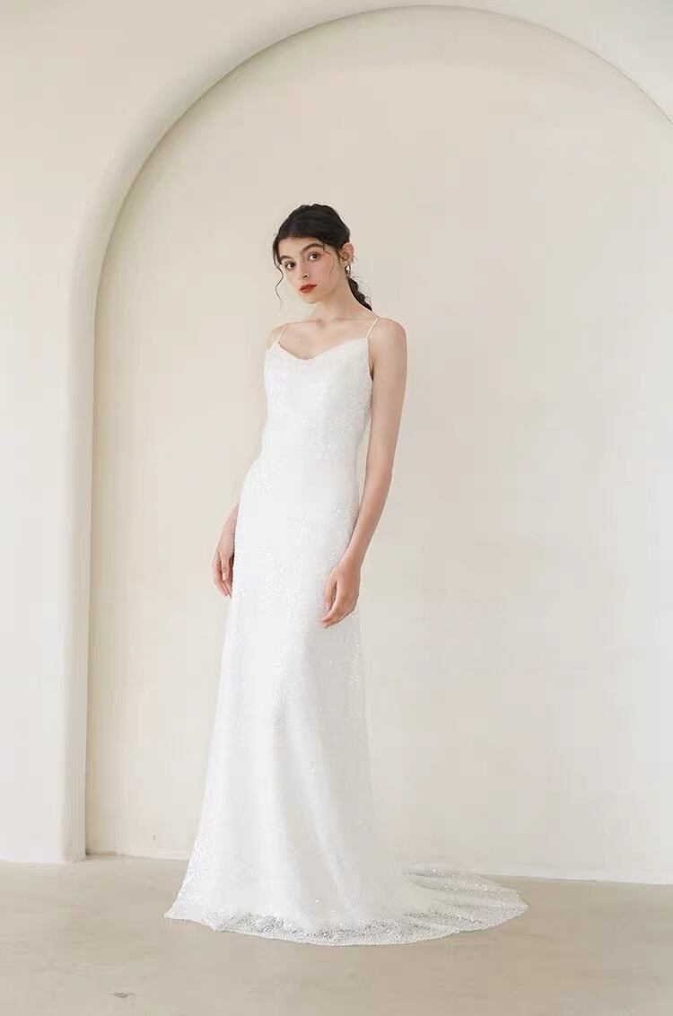シンプル サテン ウエディングドレス スレンダーライン 前撮り 二次会 大人花嫁