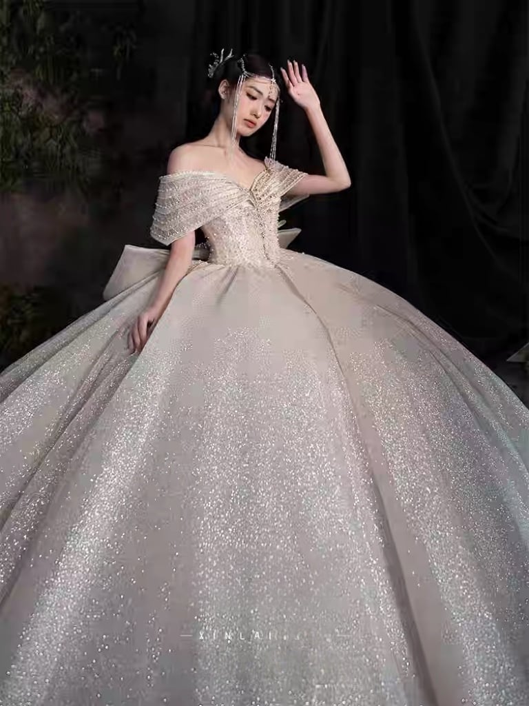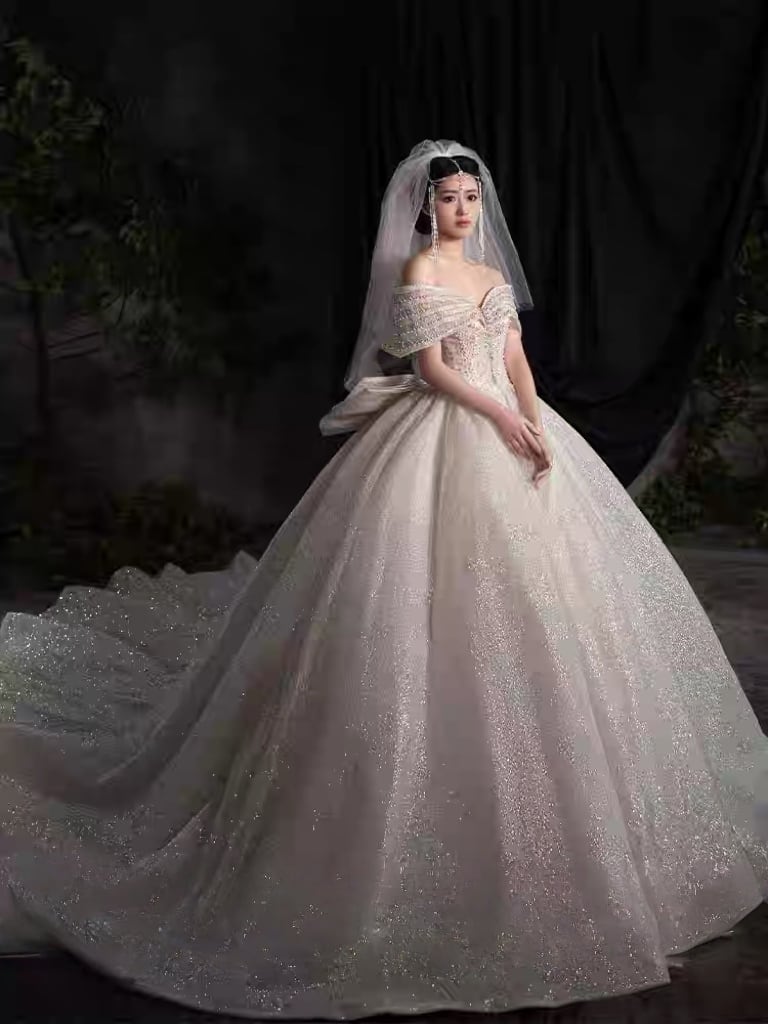 ウェディングドレス オフショルダー クラシック プリンセスライン ロングトレーン キラキラ 花嫁ドレス 挙式 前撮り 豪華 動画あり