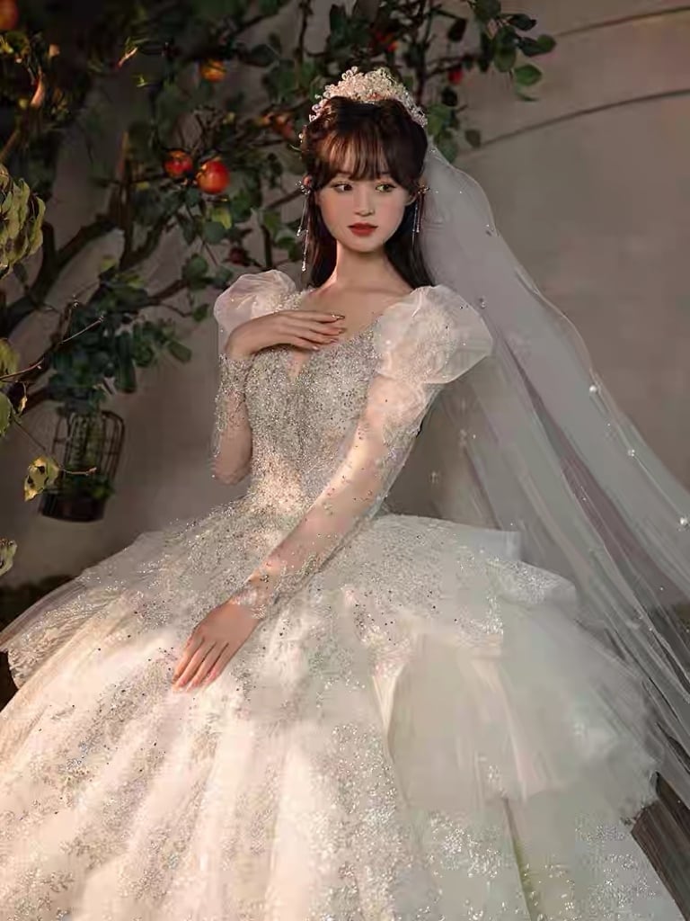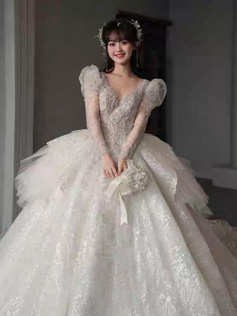 ウェディングドレス 長袖 レース プリンセスライン 可愛い キラキラ ロングトレーン 花嫁ドレス 前撮り 二次会 披露宴 動画あり