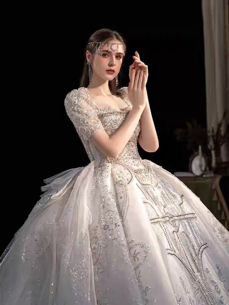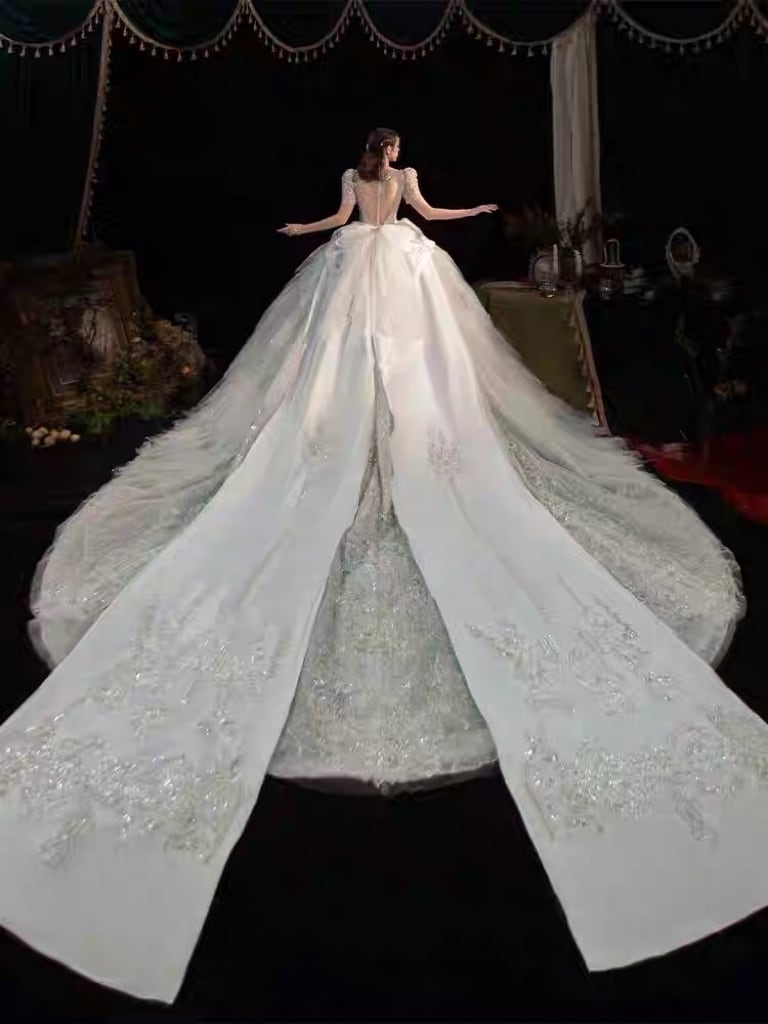ウェディングドレス スクエアネック 宮廷風 プリンセスライン 刺繍レース ロングトレーン 花嫁ドレス 豪華 挙式 前撮り 動画あり