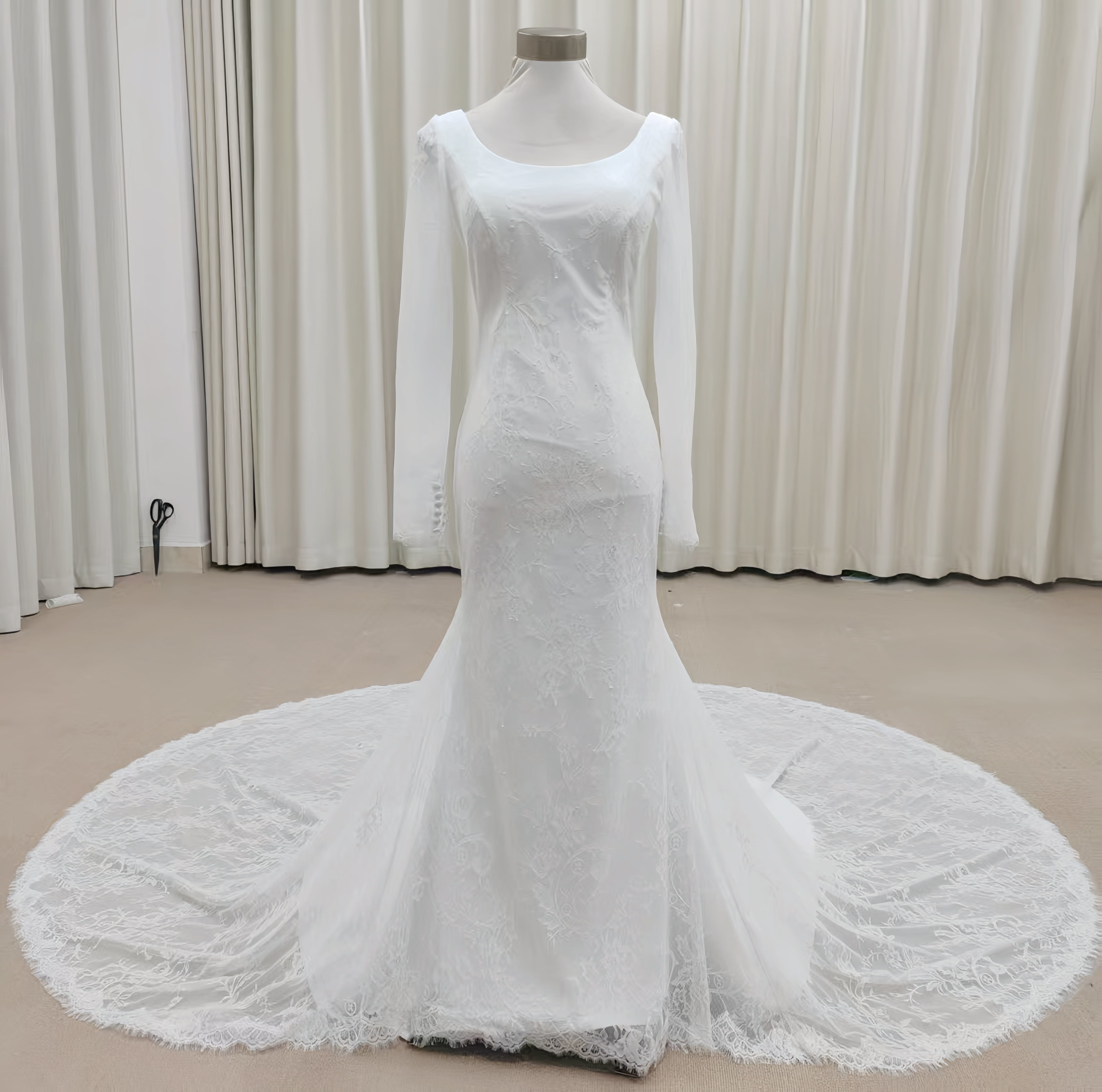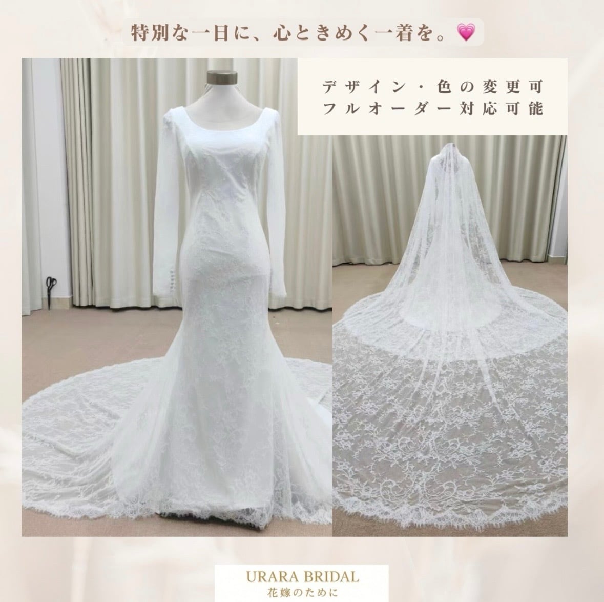 優雅な長袖マーメイドドレス|繊細レース×ロングトレーン|背中Vデザインのウェディングドレス