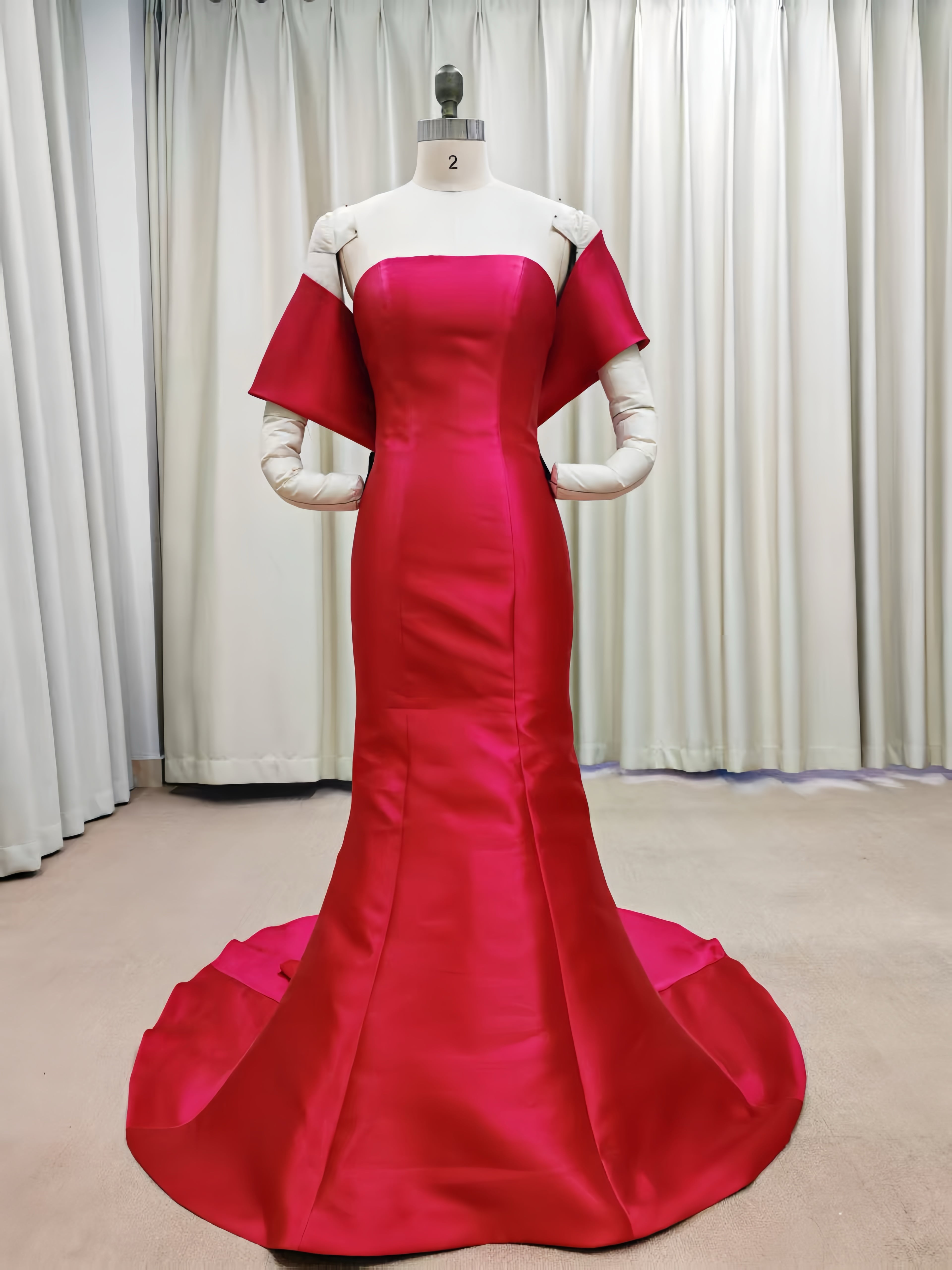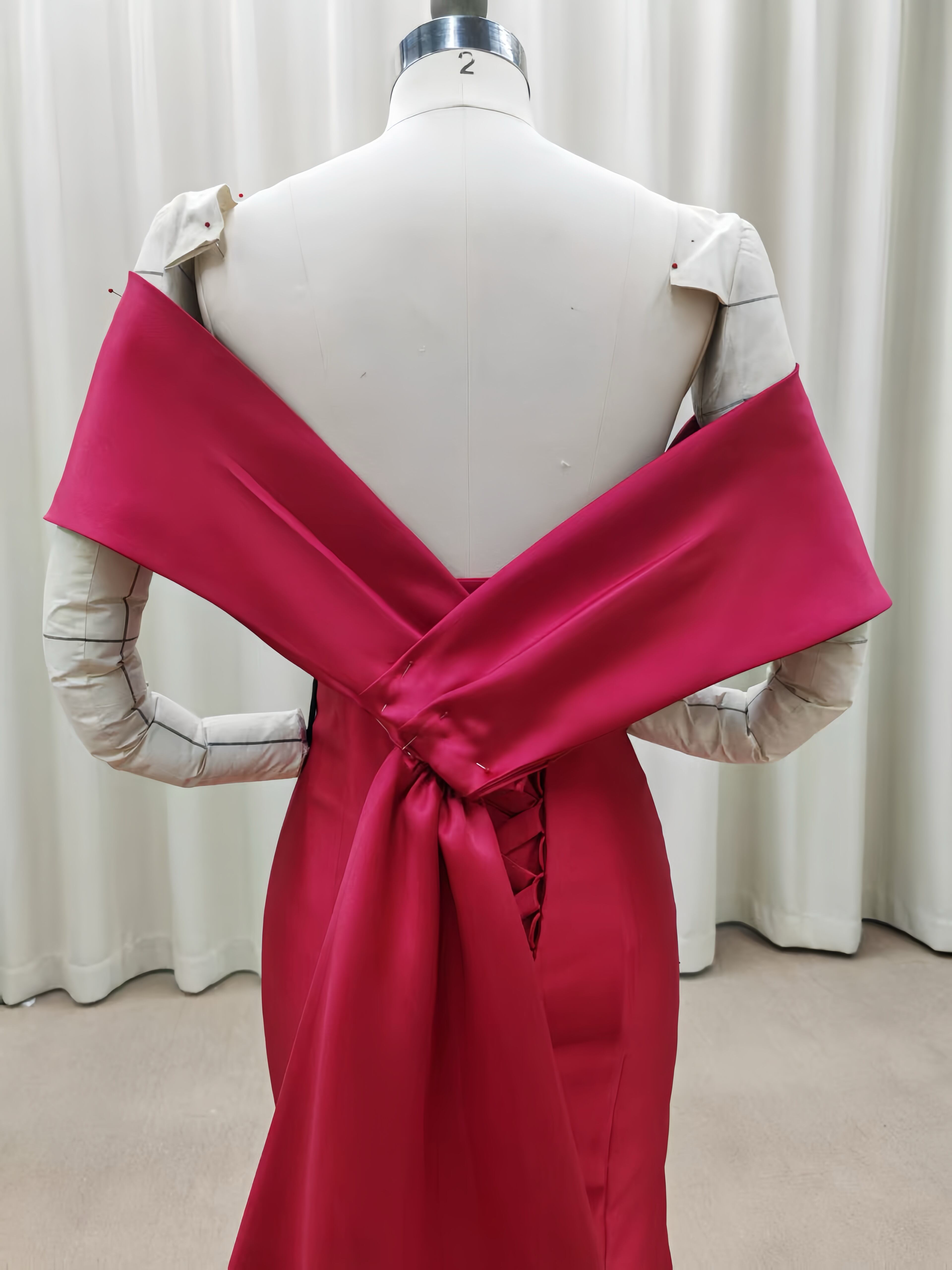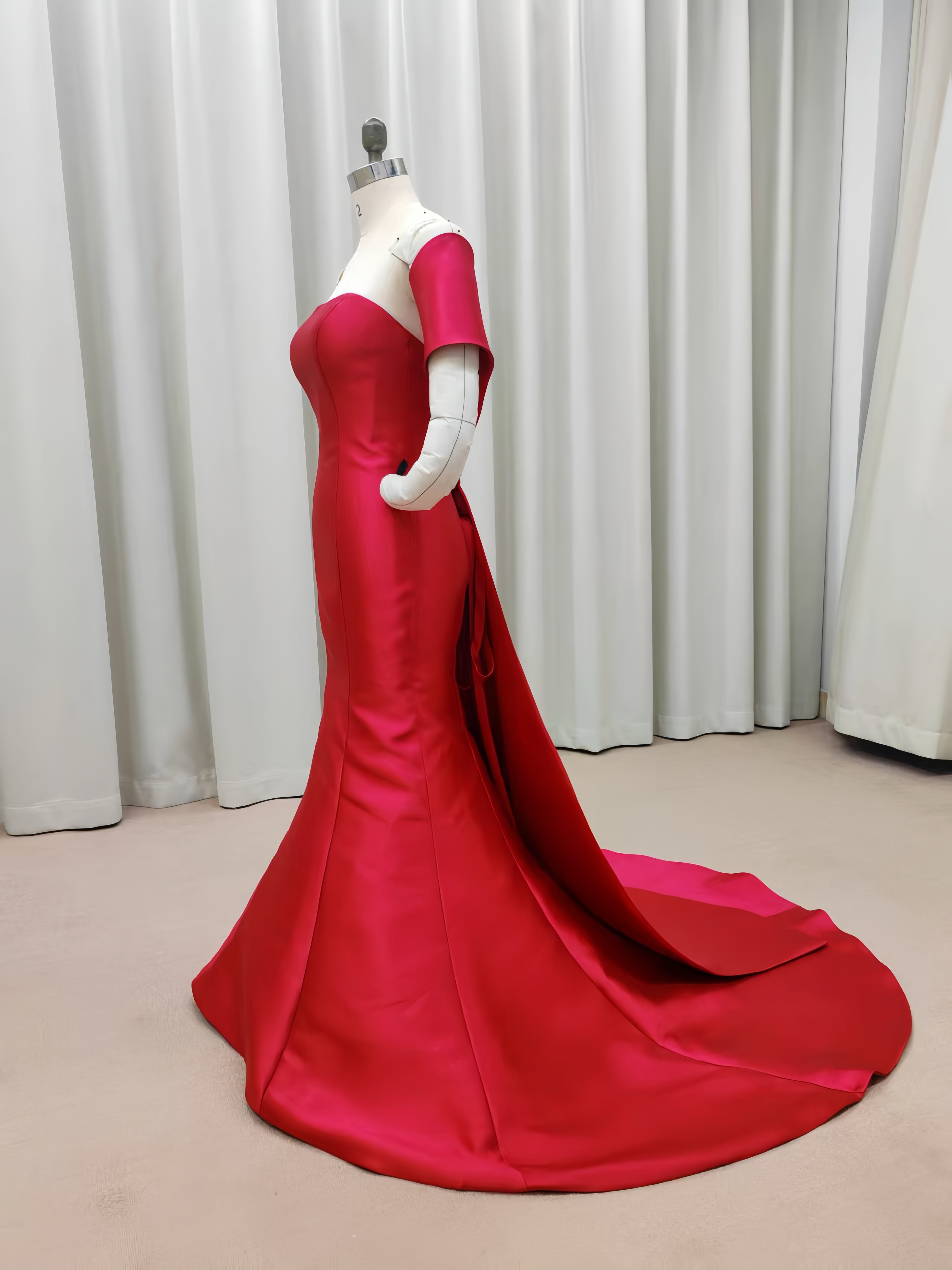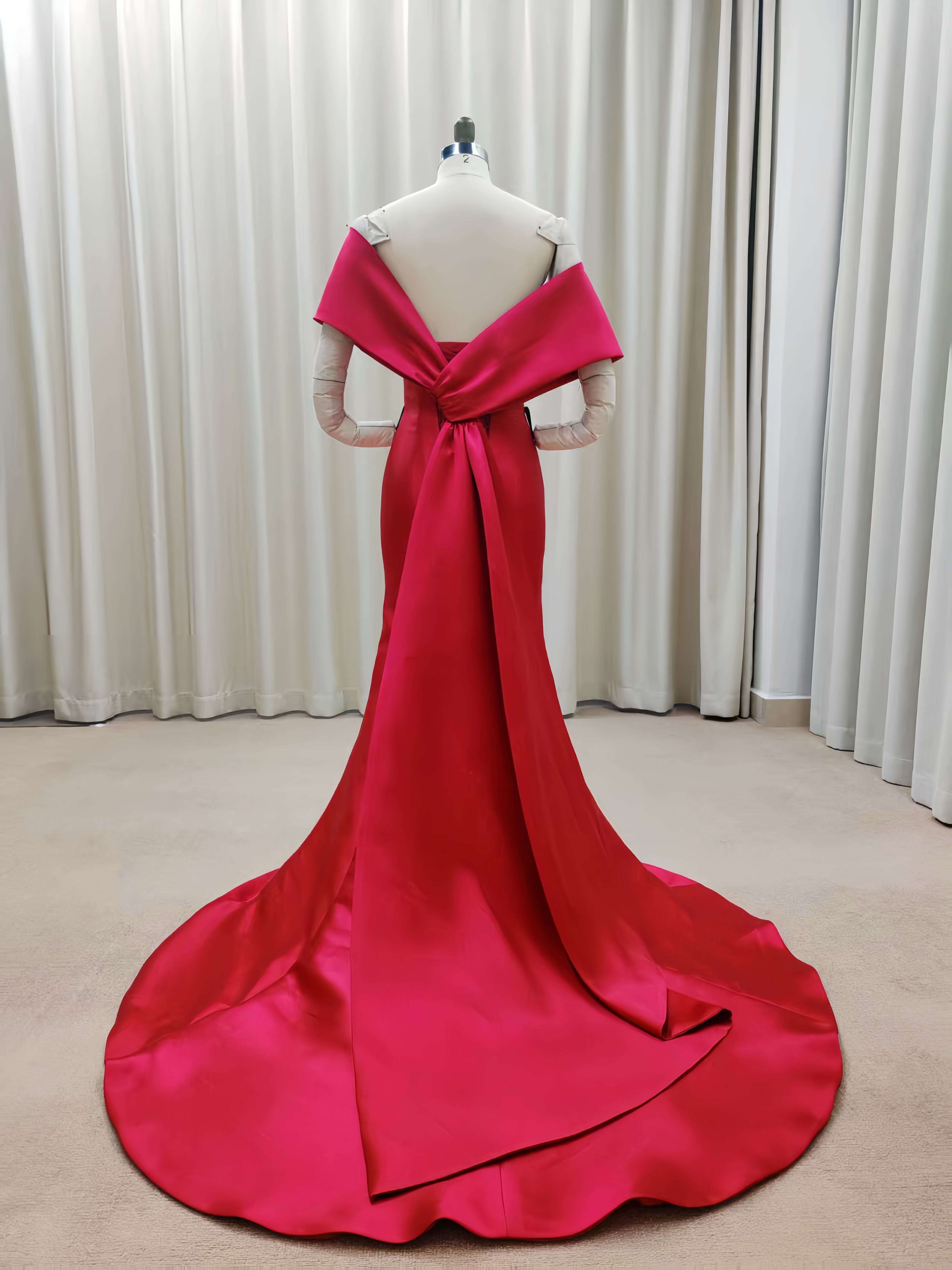 赤 サテン マーメイドドレス ロングトレーン オフショルダー ウェディングドレス カラードレス 背中リボン 二次会 前撮り