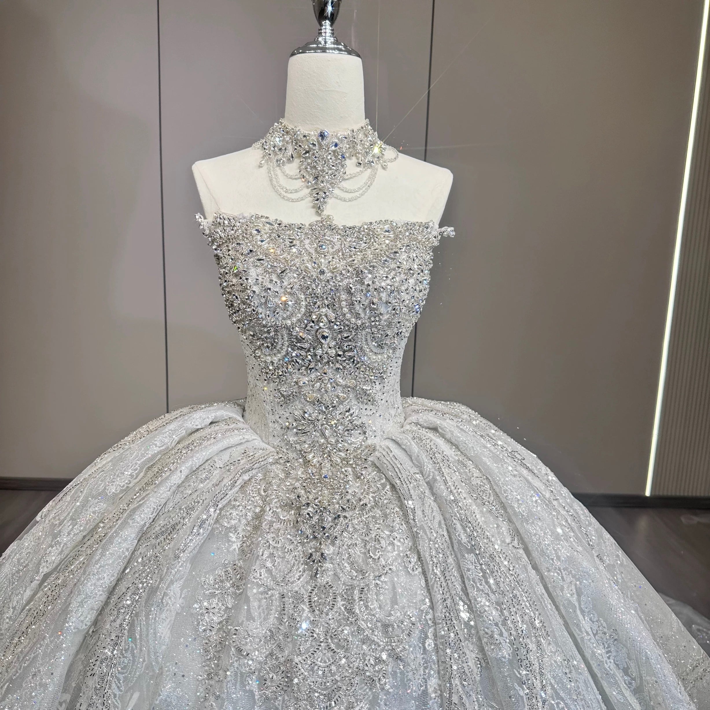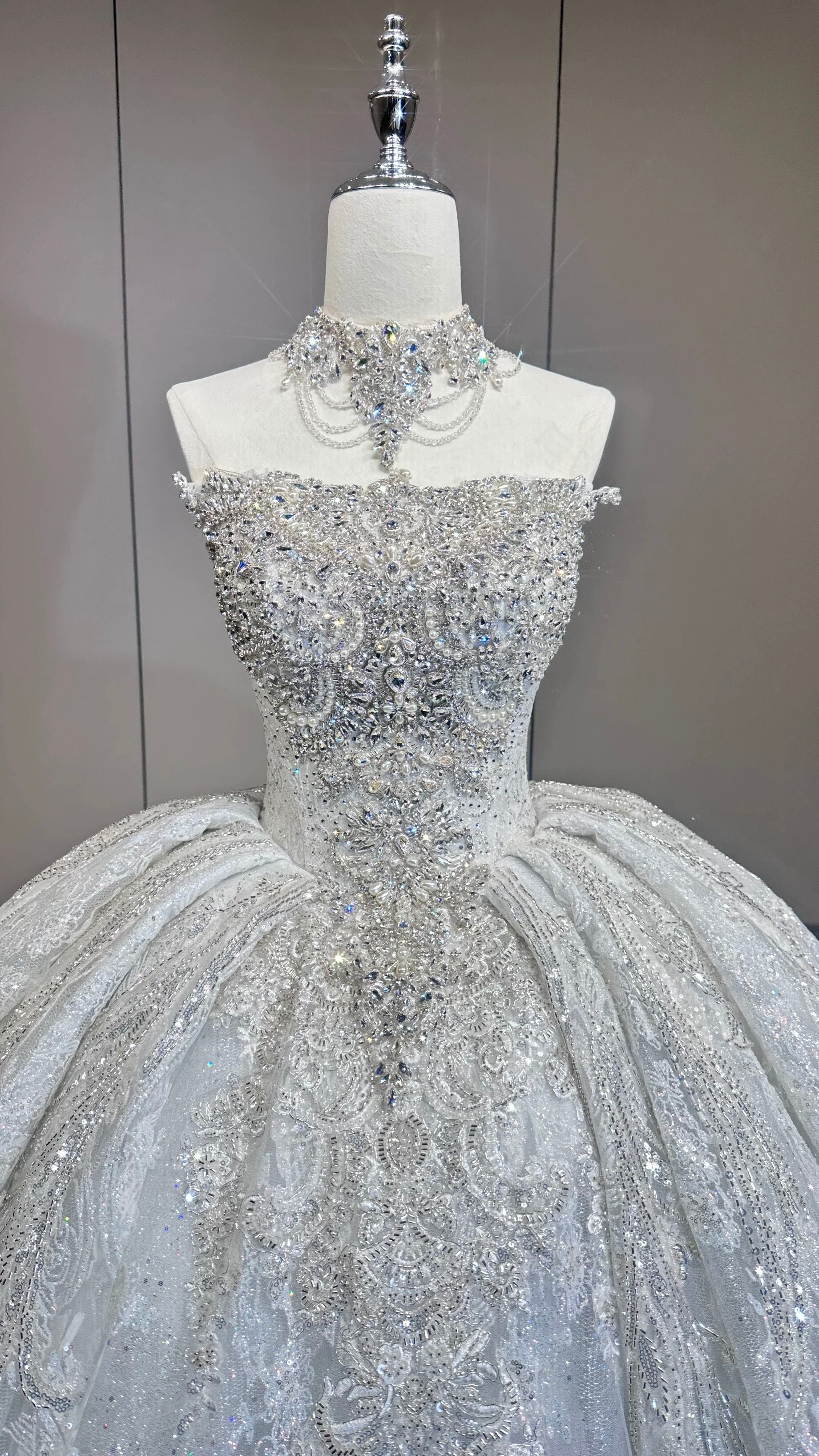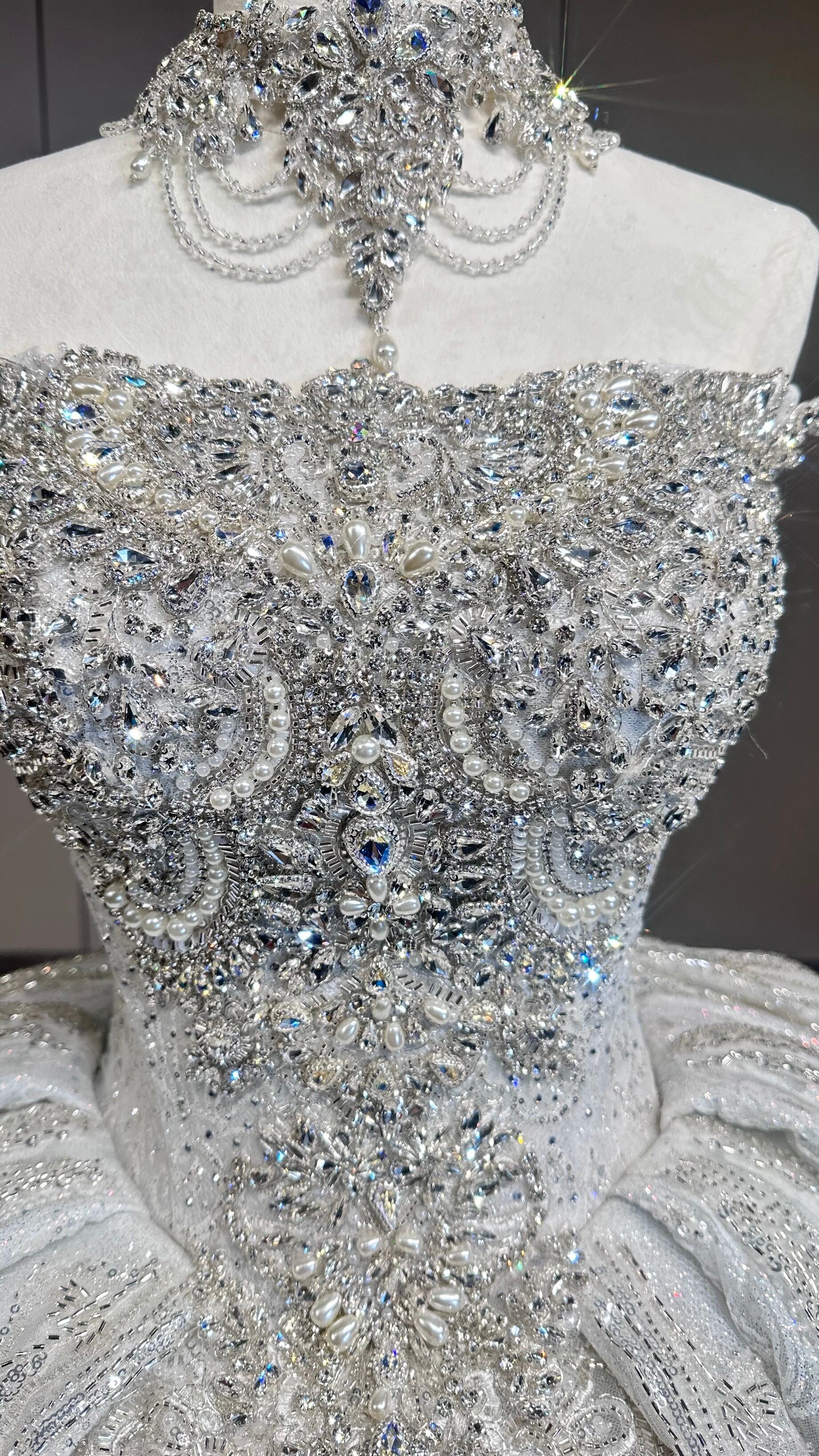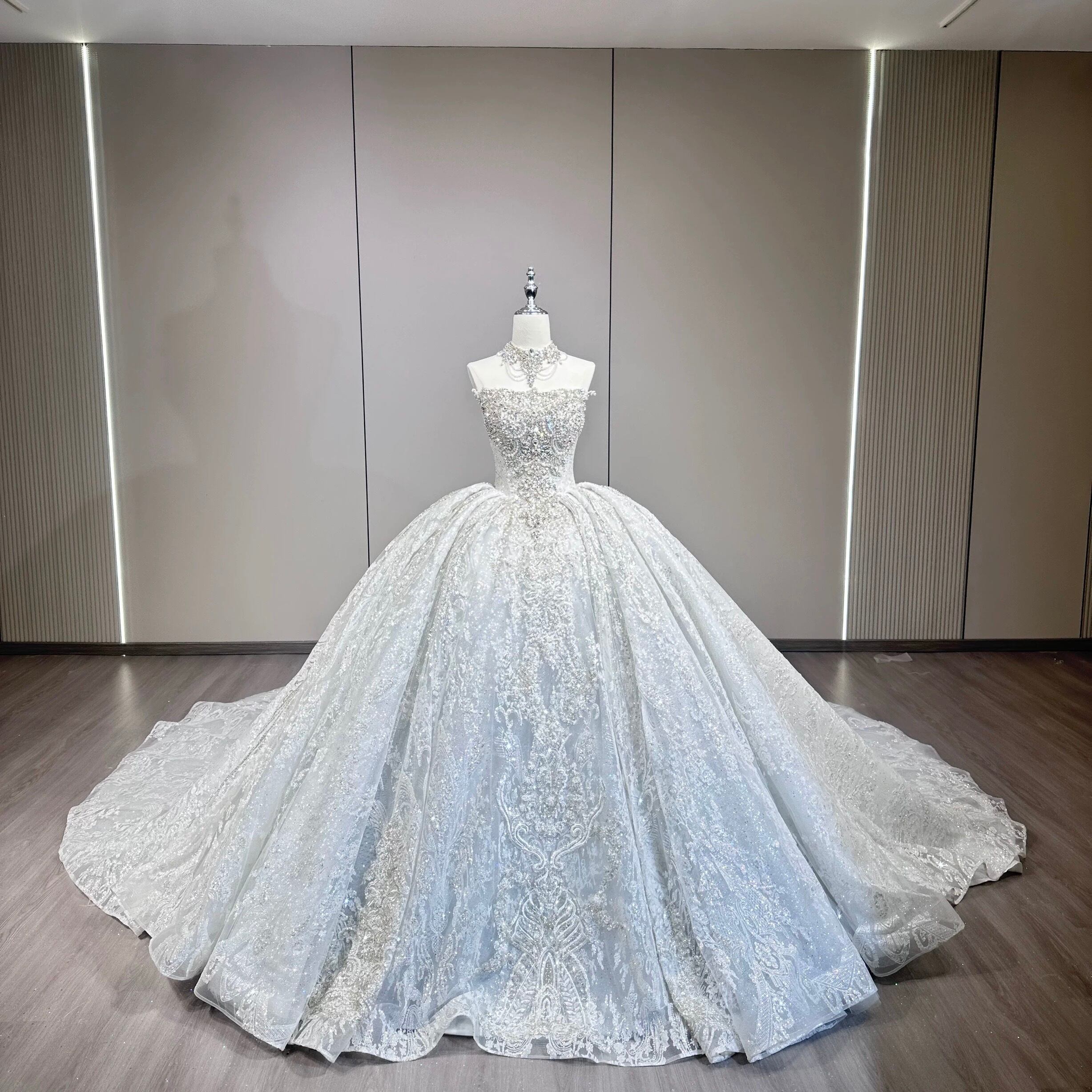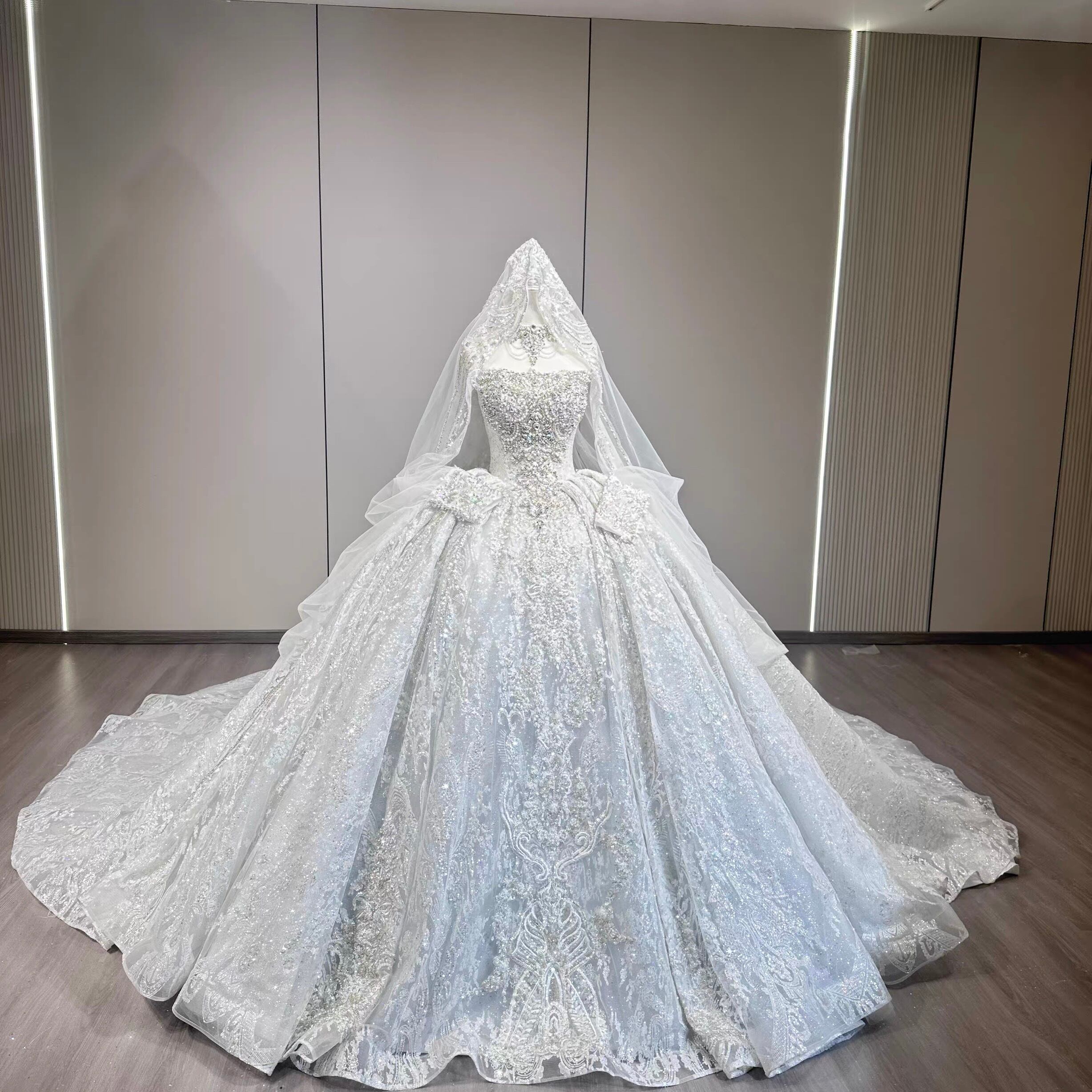 豪华刺繍プリンセスライン ウェディングドレス ロングトレーン ベール付き