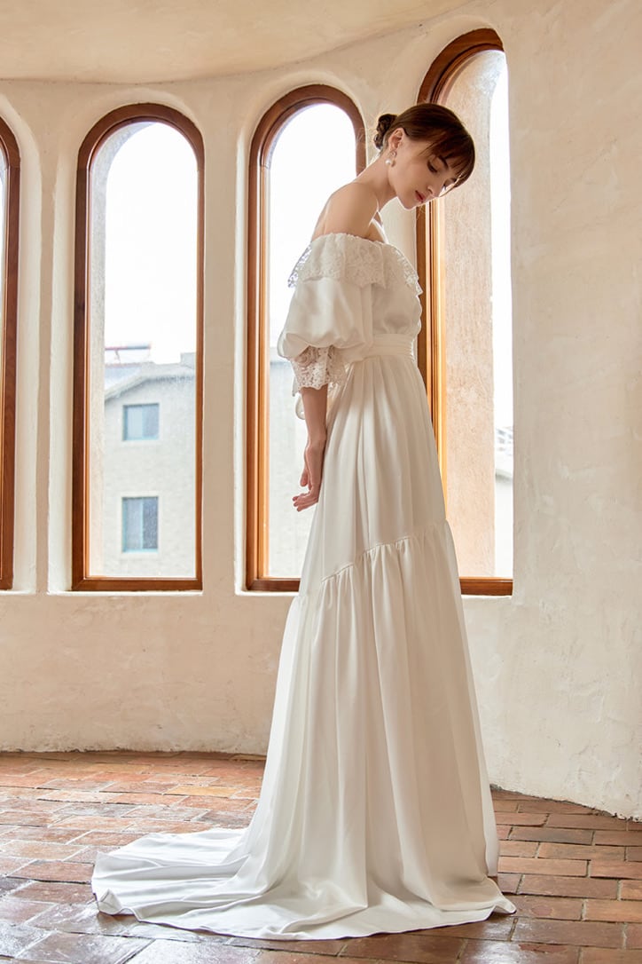 オフショルダー パフスリーブ ウエディングドレス 前撮り 二次会