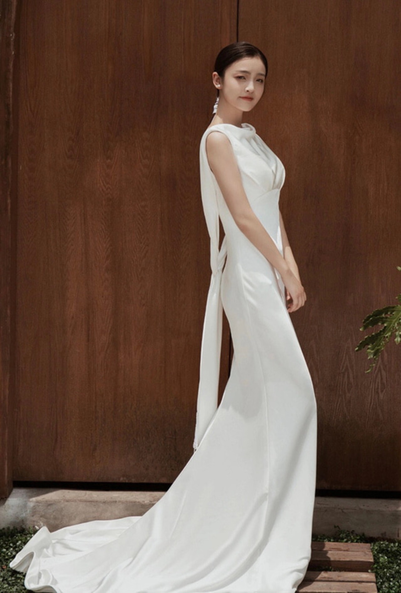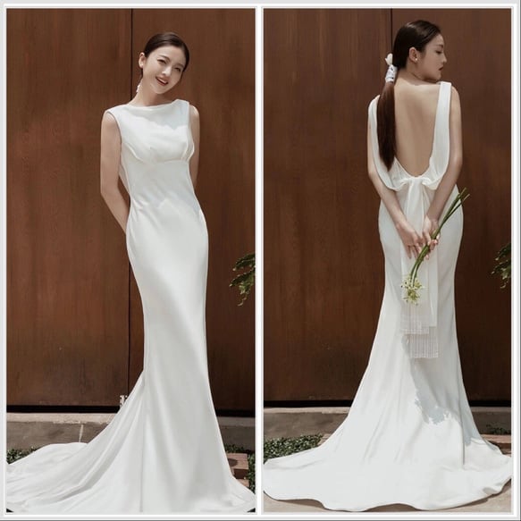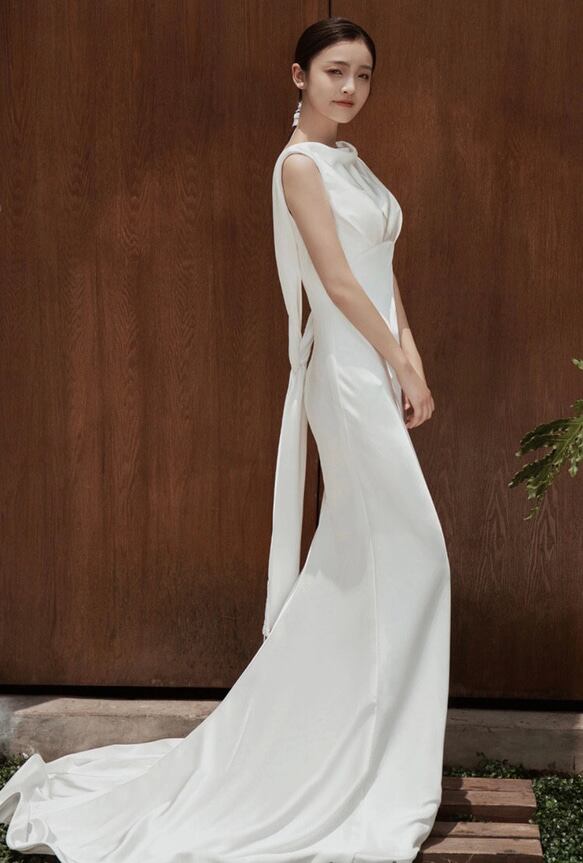 シンプル リボン サテン ウエディングドレス 2次会