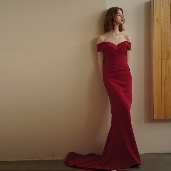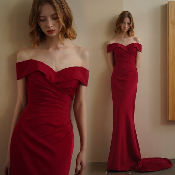 オフショルダーレッドドレス 二次会 カラー変更OK
