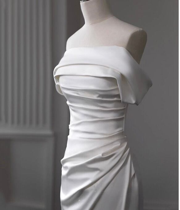 シンプル オフショルダー サテンウエディングドレス