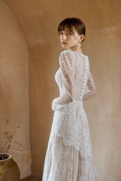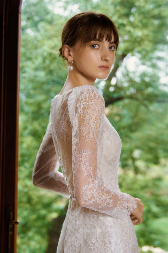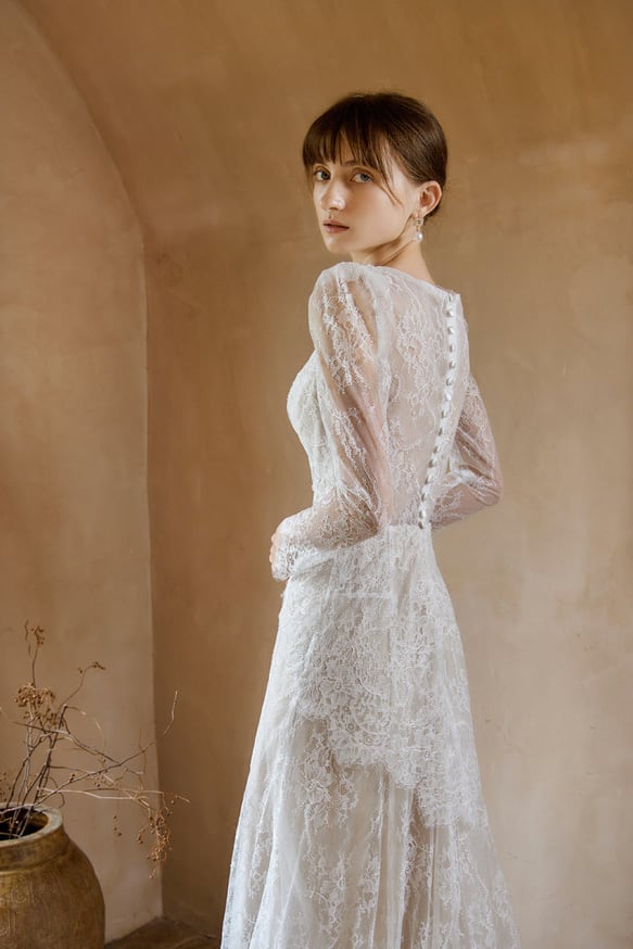 Vネック 長袖 総レース ウエディングドレス 二次会 前撮り