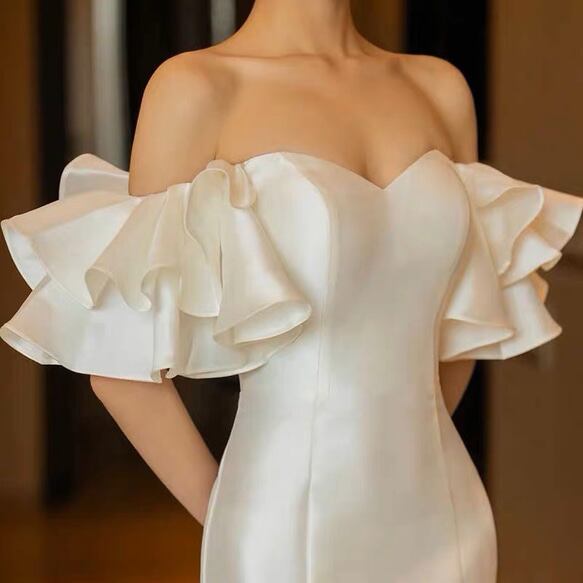 フリル袖 サテン オフショルダー マーメイドウエディングドレス