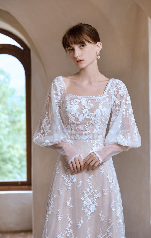 パフスリーブ スクエアネック 花柄総レースウエディングドレス