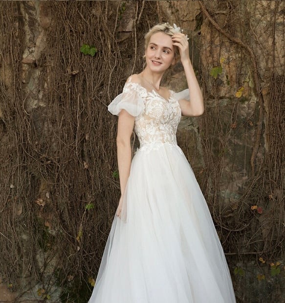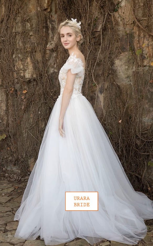 レース刺繍 オフショルダー ウエディングドレス 二次会 フォト