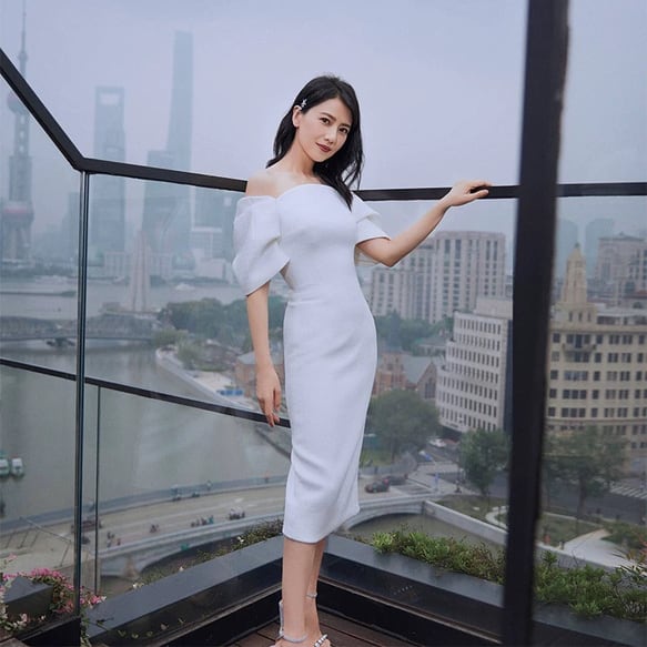 シンプルサテン オフショルダー ミディ丈ウエディングドレス