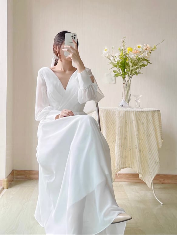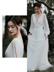 長袖シフォン Vネック ウエディングドレス フォトウエディング