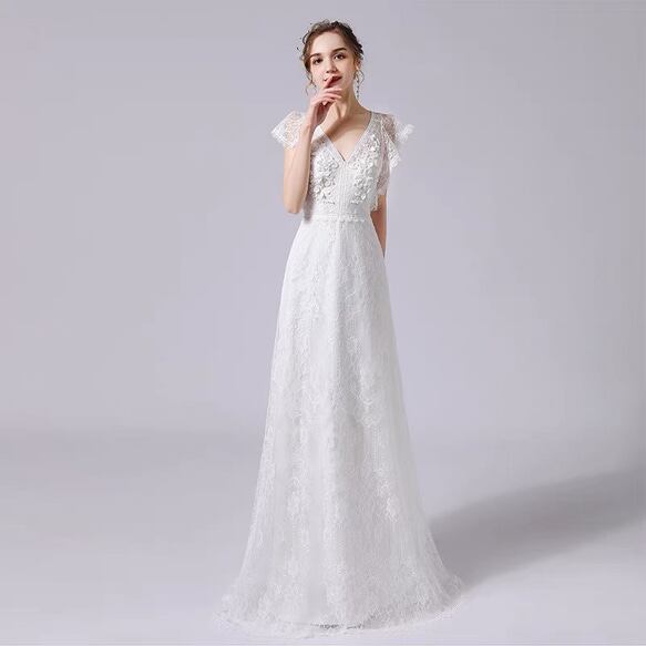 Vネック フリル レースウエディングドレス 二次会 フォト