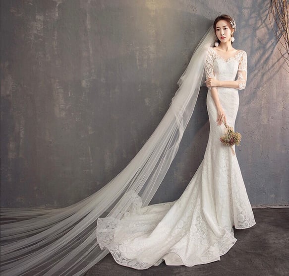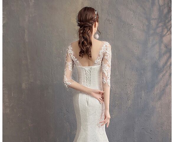 総レース Vネック 5部袖 マーメイドウエディングドレス