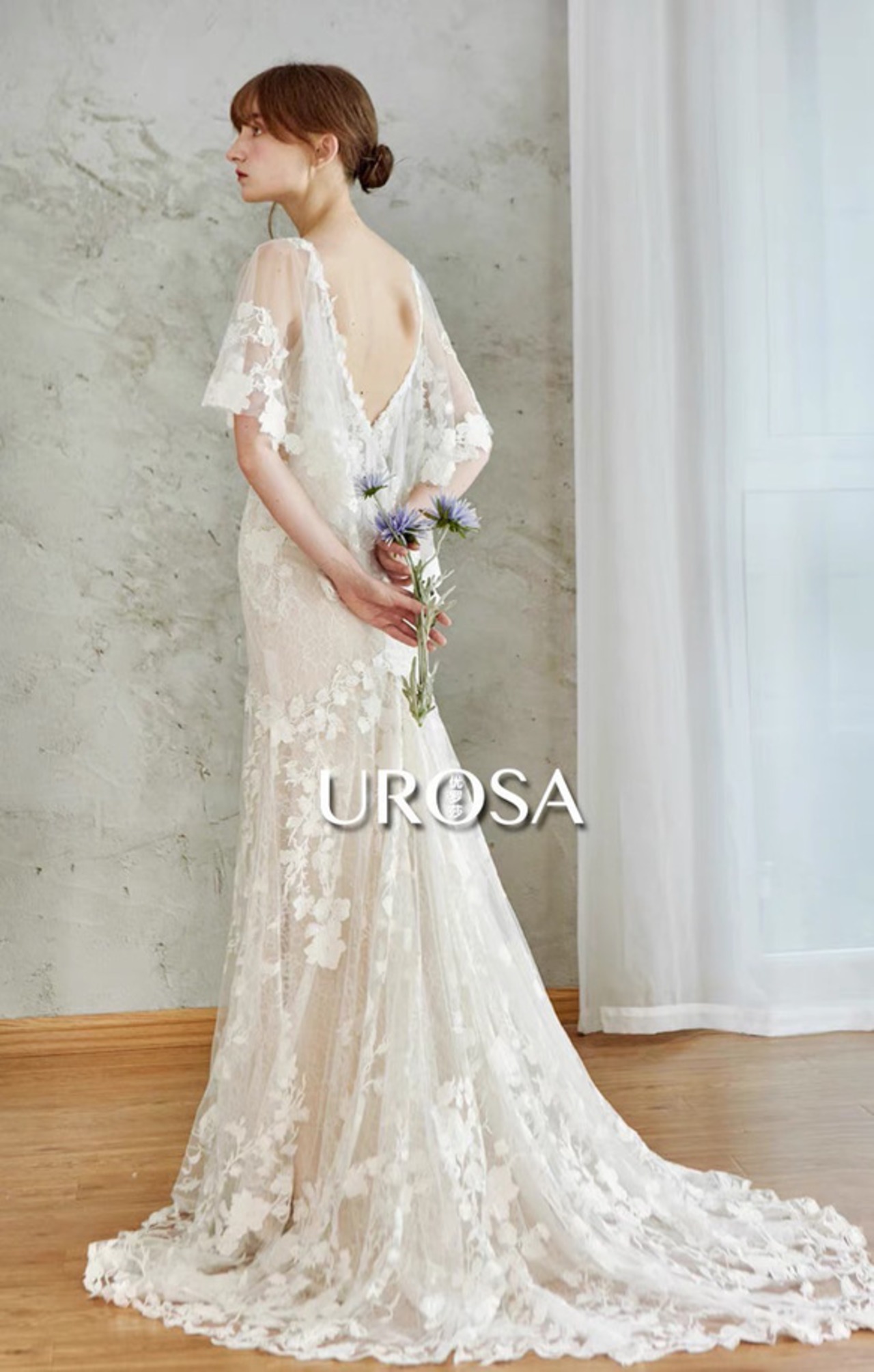 Vネック フリル袖 レースウエディングドレス 二次会 フォト