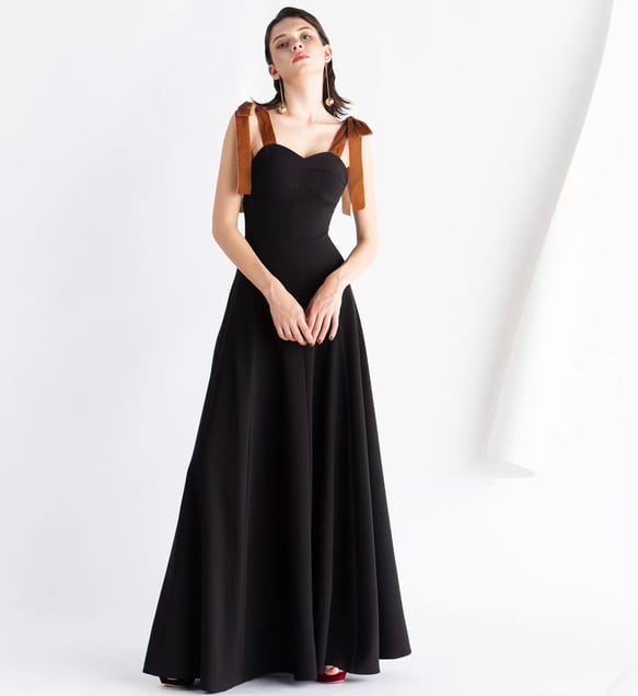 エレガント 肩リボン ブラックパーティドレス 演奏会 二次会